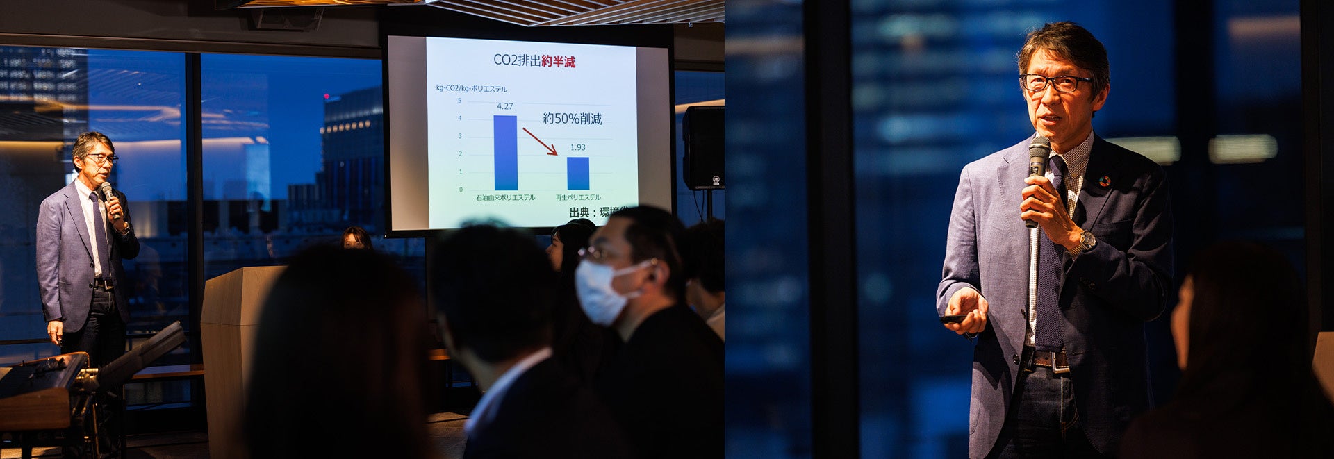 ゲストとして株式会社JEPLAN(旧 日本環境設計)取締役 執行役員会長 岩元美智彦様、株式会社Biome(バイオーム)代表取締役 CEO 藤木庄五郎様、一般社団法人unisteps 共同代表 鎌田安里紗様、タジマ工業株式会社 経営企画室 三矢実奈様、公益財団法人日本自然保護協会 岩橋大悟様、世界的アニメーション監督の河森正治様、フランス人クリエイターのロマン・トマ様にお越しいただき、有識者登壇をしていただきました。