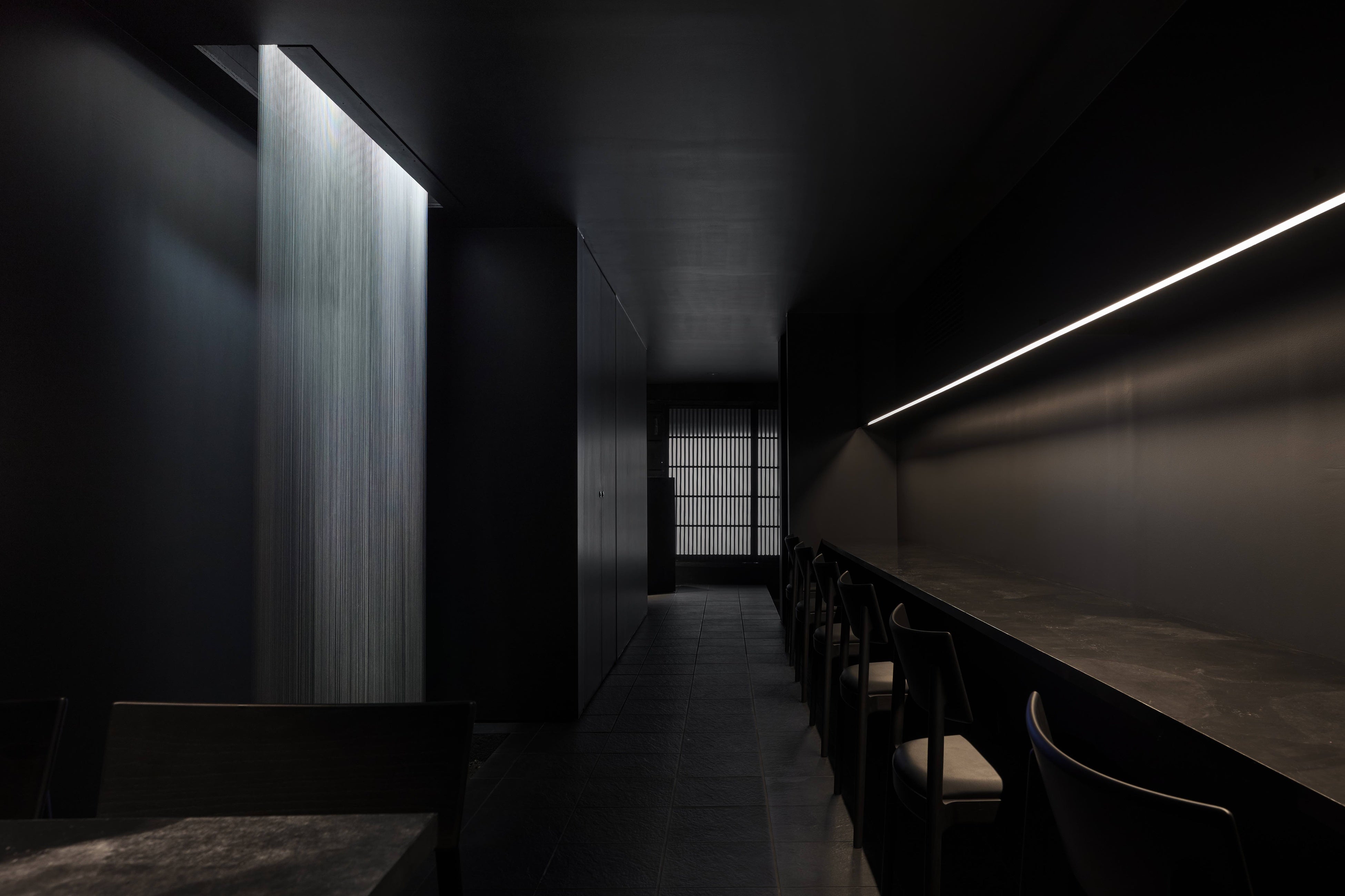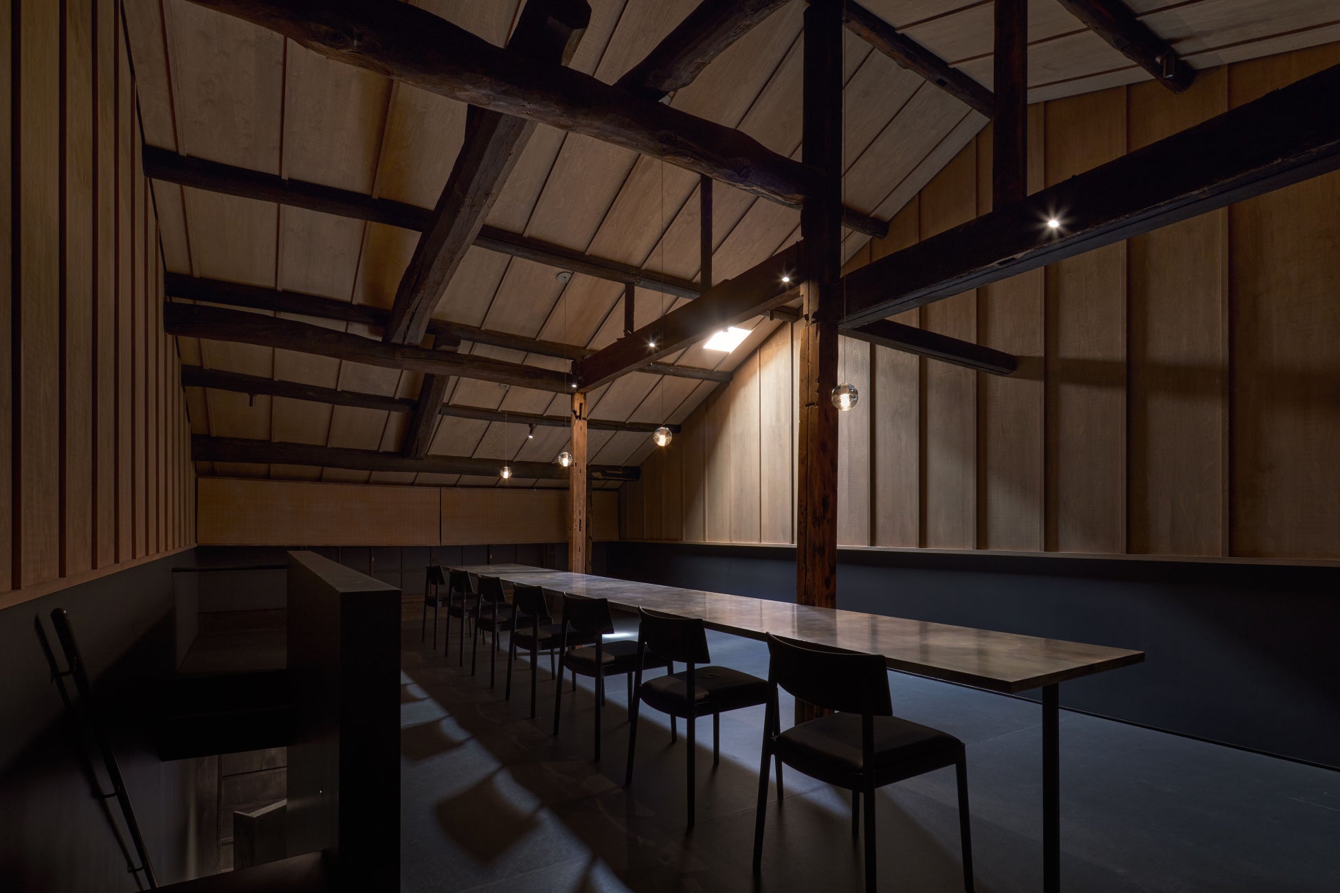 外観や柱、梁など京町家らしい特徴は残しながら、ちぎり絵から着想を得た現代日本のアートのようなテーブルを設え、落ち着きと新鮮さが同居する空間となっています。