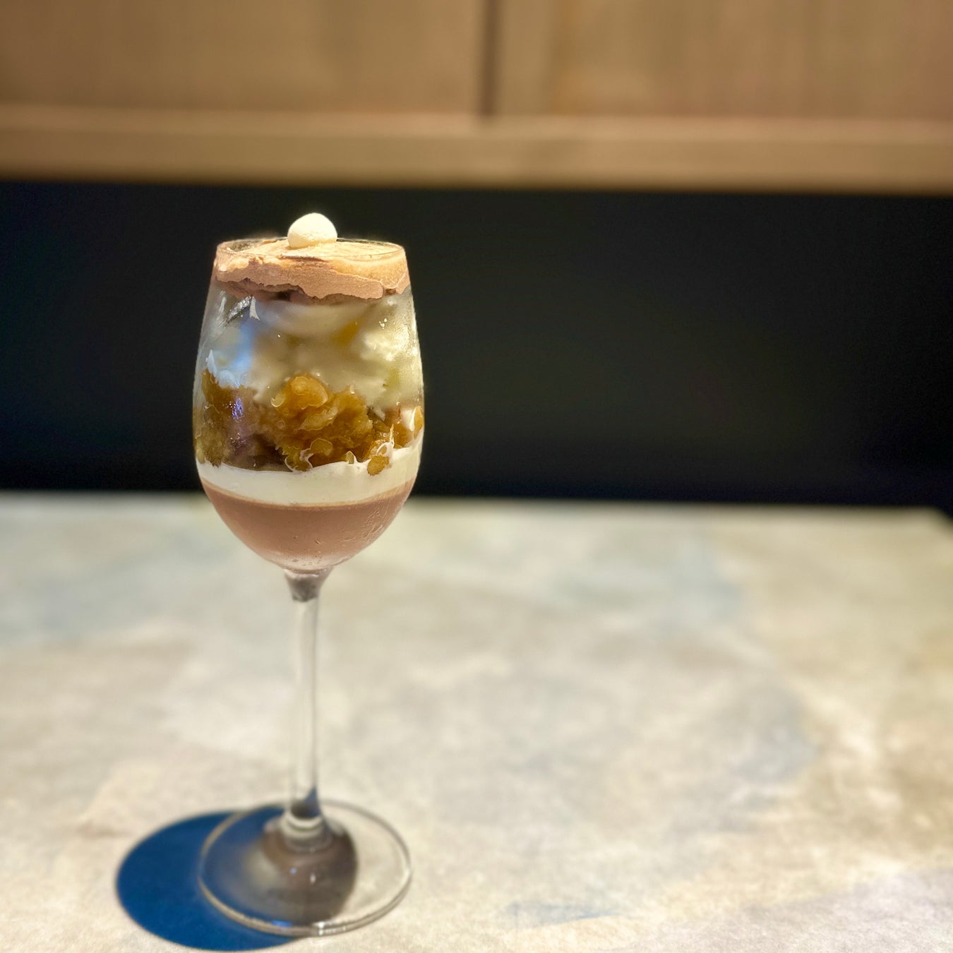 KASANEは、大人である喜びを感じてもらいたいというコンセプトのパフェです。チョコとバナナがシンプルな味わいから食べ進むにつれて複雑になる味わいに変化することを感じながら、違いがわかる大人になったという気づきを得てもらいたいという作品です。