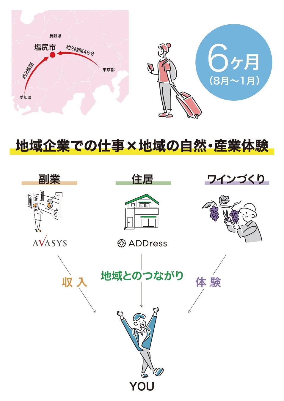 また、この社会実験には多拠点生活プラットフォームを運営するADDress(株式会社アドレス)、塩尻市内ワイナリーに協賛いただき実現します。