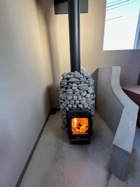 エストニア産のストーブに近隣から取り寄せた広葉樹で薪を焚いていきます。