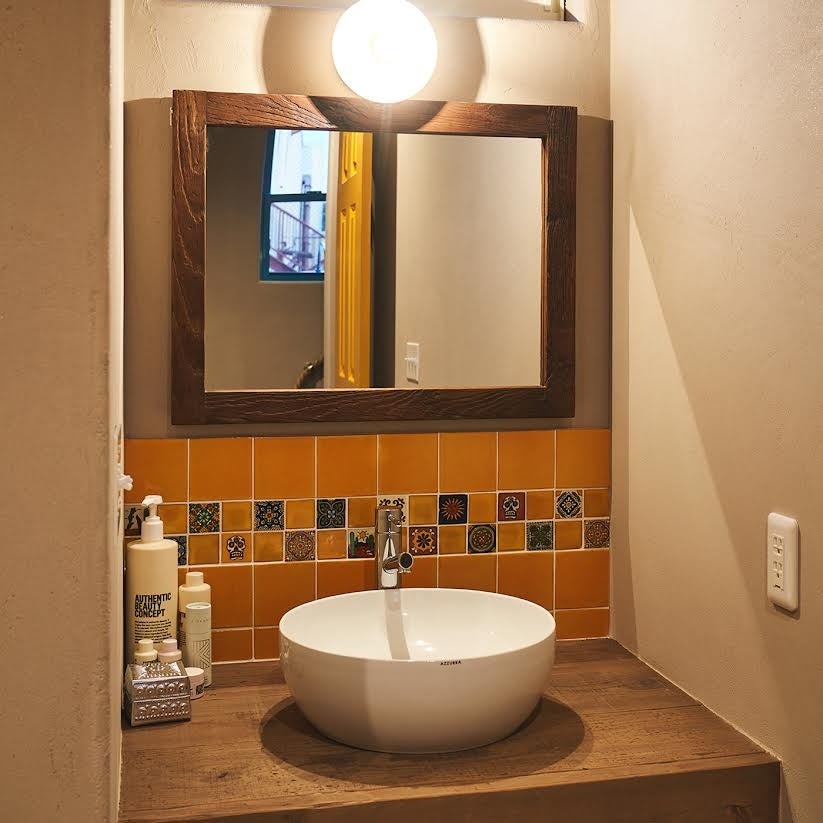 デザイナーがサンタフェで買ってきたメキシコのタイルがポイントのパウダールーム。 KISUKANUのCBDフェイスオイル、 シャワールームにはAuthentic Beauty Conceptのヘアプロダクツを置いています。