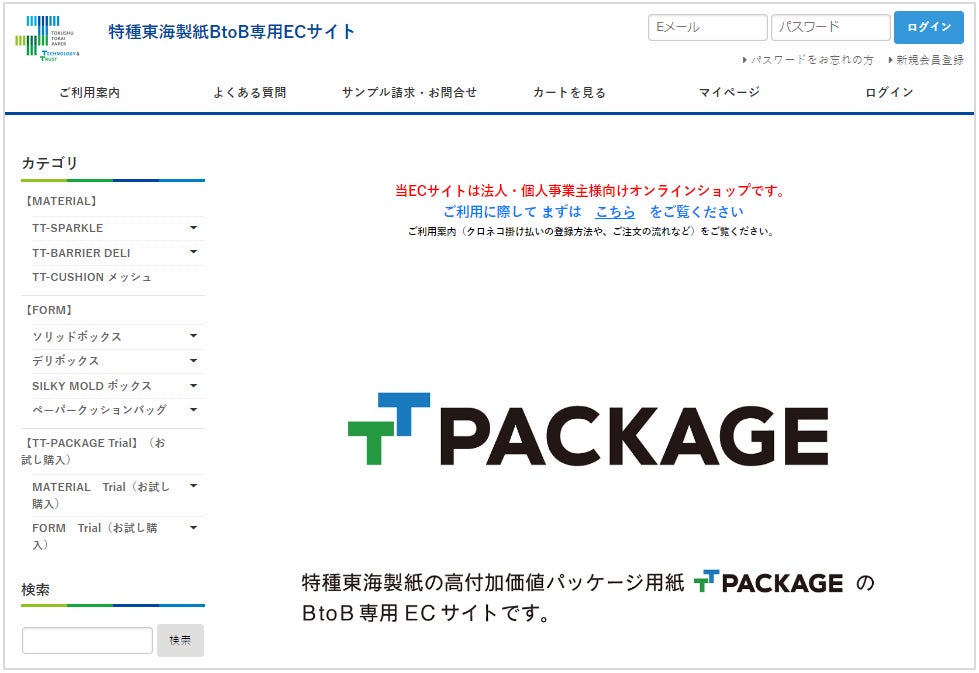 特種東海製紙 パッケージ本部が運営する「BtoB専用ECサイト」。これまでは梱包単位(例:100個)でのご購入でしたが、1個からお買い求めいただけるようになりました。