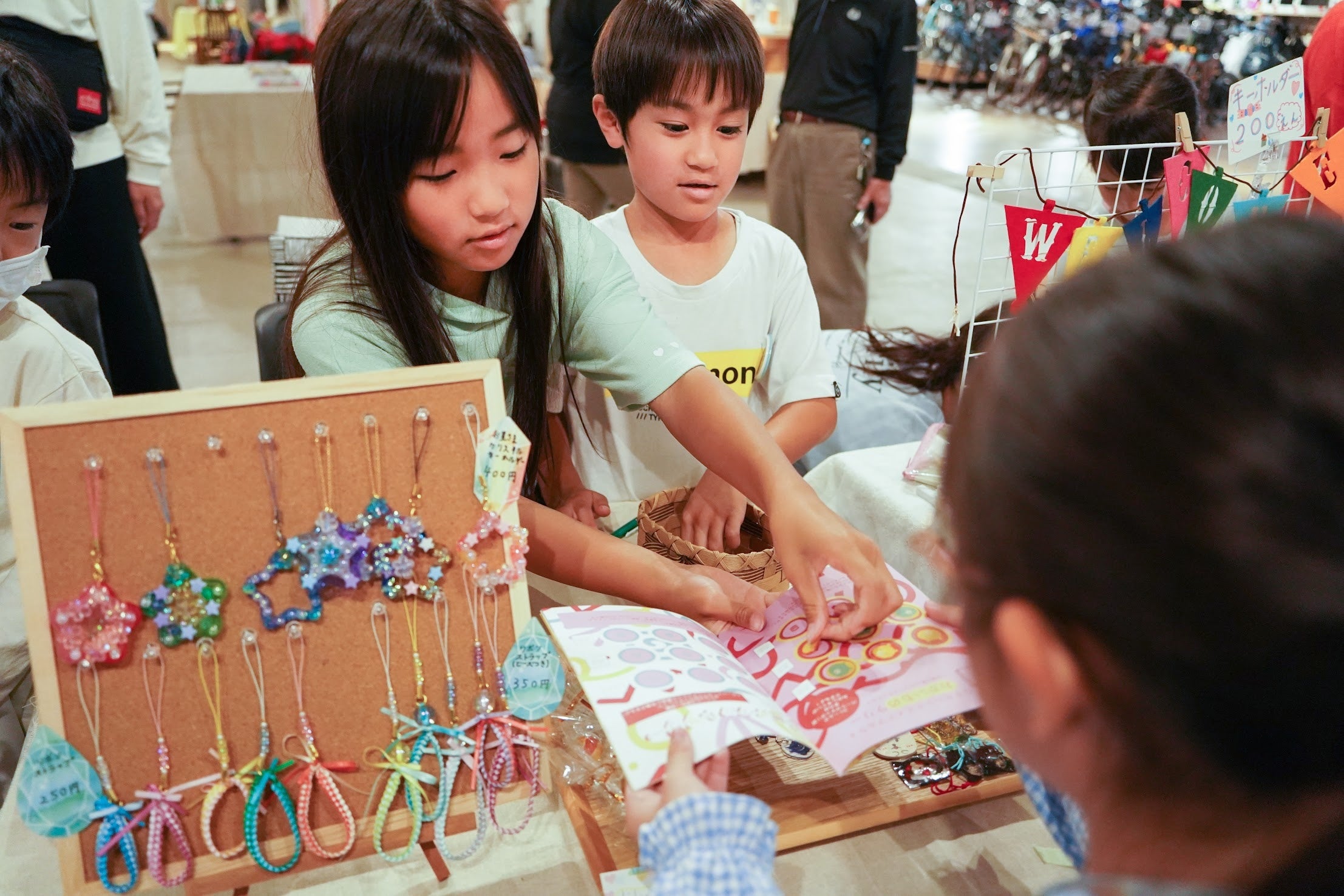 ジブンで作ったものを売るコドモたちのマルシェです。お店の名前、値決め、パッケージ、ディスプレイ、そして当日の接客からお金のやり取りまでコドモたち中心におこなっています。