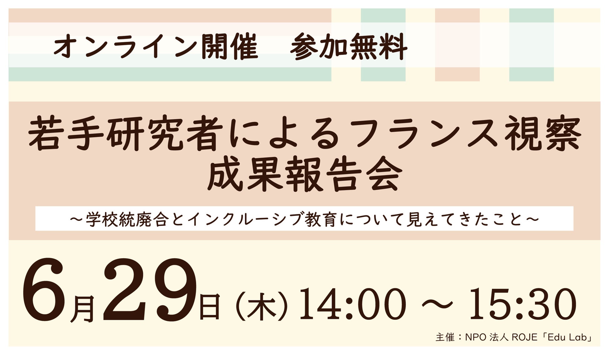 6/29(木)14時より、フランスの学校統廃合とインクルーシブ教育の現状について、現地を訪問してきた2名の研究者が報告するオンラインイベントを行います。