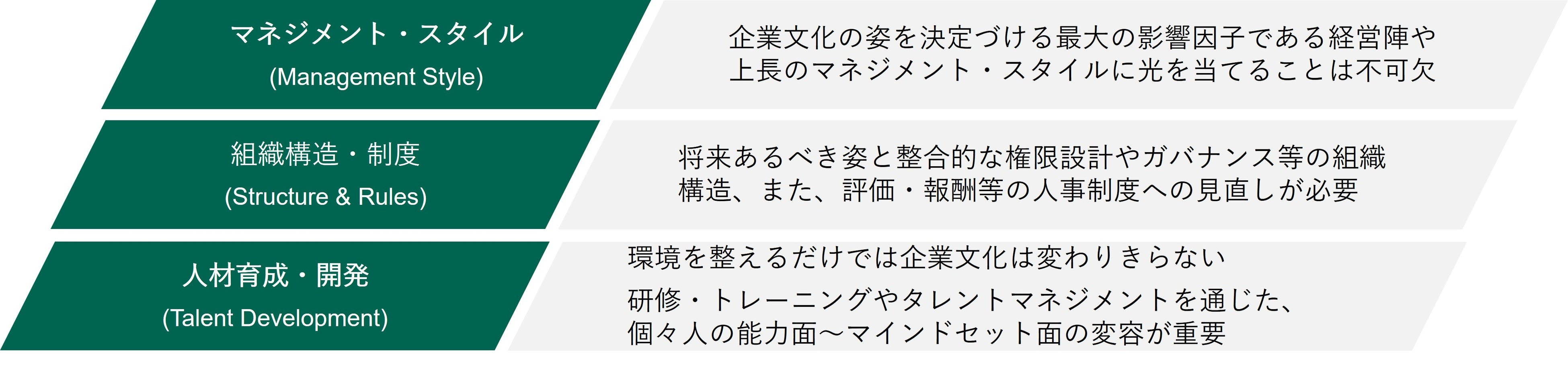 これまでの企業文化の改善・変革への支援実績から、改善・変革の成否を大きく左右するキーファクターが3つ存在することを特定しています。”打ち手”を講じるにあたって、これらのキーファクターに光を当てて織込んでいくことが効果的です