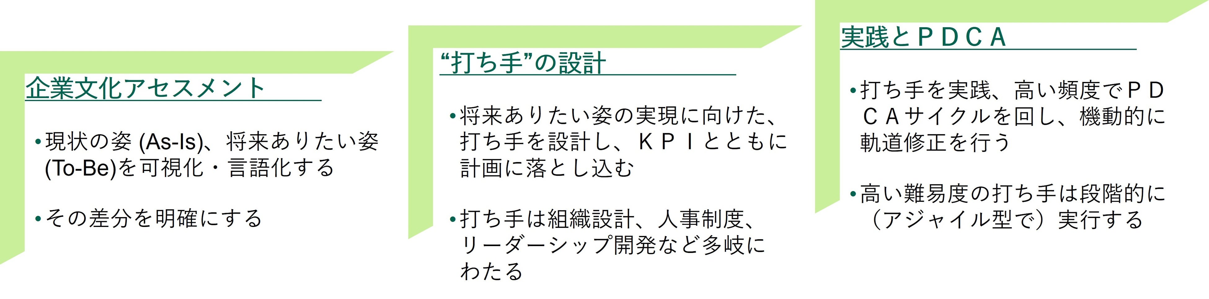 企業文化の強化・変革の実現までの道のりは以下の3ステップで構成されます。