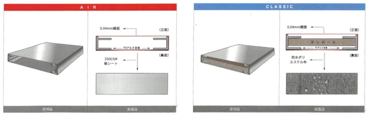 「割れない“魔法の鏡”」は、鏡面と裏面の間にダンボールを挟み、裏面に防水ポリエステル布を貼った「CLASSICシリーズ」と、ダンボールを挟まず裏面を紙シートで仕上げた「AIRシリーズ」の2つのシリーズがあります。