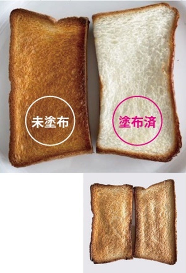 食パンを2等分して右側だけにプロテクセラムを塗布して、300℃で5分間トースターで焼いた結果が右の写真に