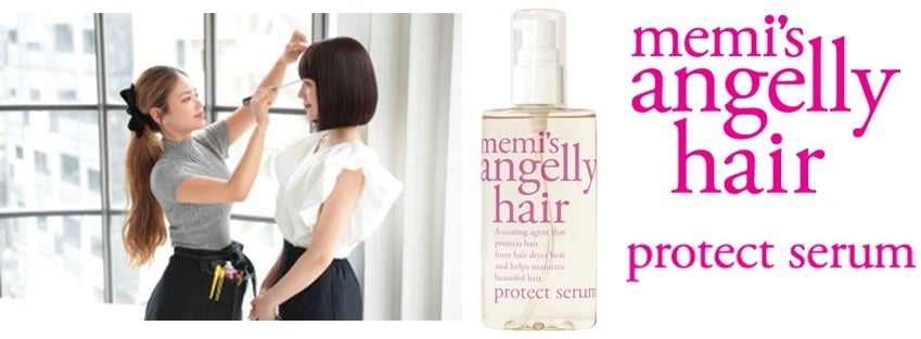「memi’s angellyhair]」のプロテクトセラムはドライヤーやコテの熱から髪を守りながらヒアルロン酸・アミノ酸・ケラチンを含んだジェルがパサついたダメージ毛を包み込み、剥がれそうなキューティクルを修復、毛先までツヤのあるしなやかな髪に仕上げます。