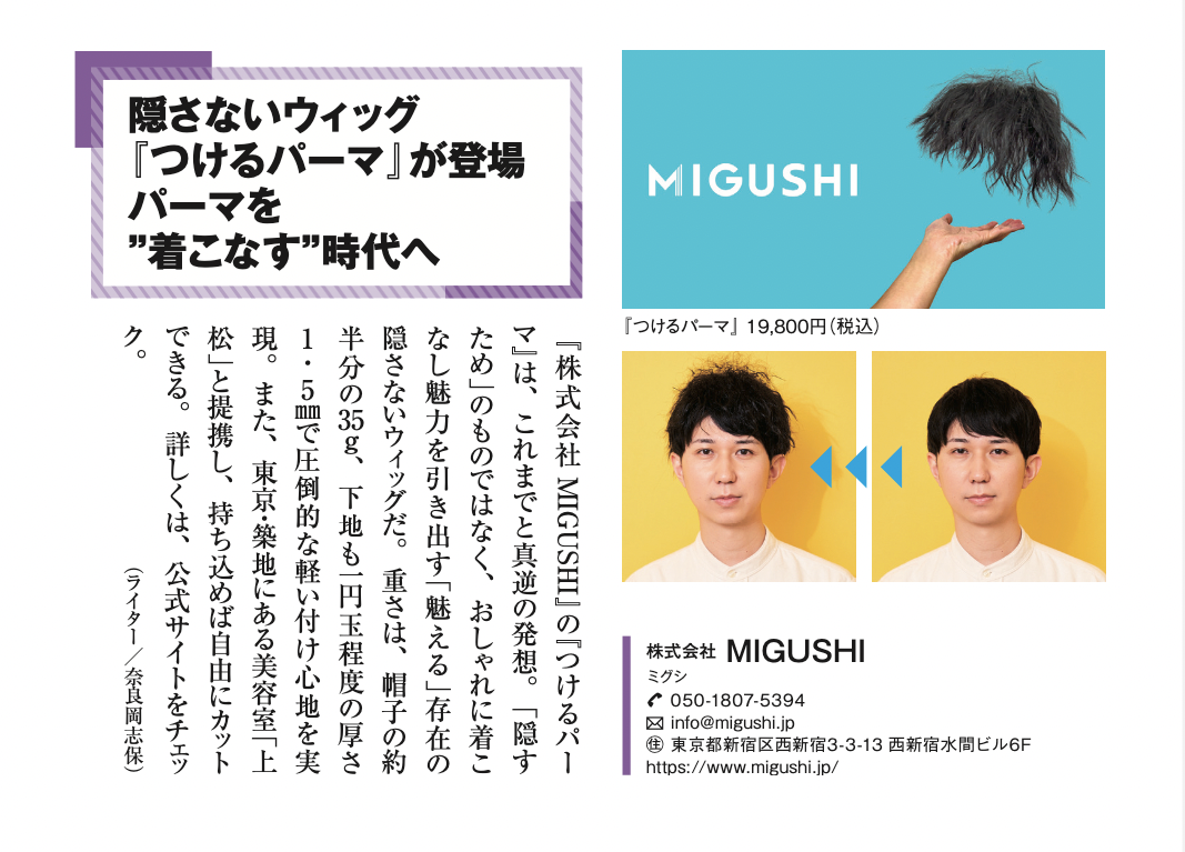 2023年9月7日(木)に株式会社ミスターパートナーから出版された「令和のベストヒット大賞 2023年度版」にて、MIGUSHIの『つけるパーマ』が掲載されました。