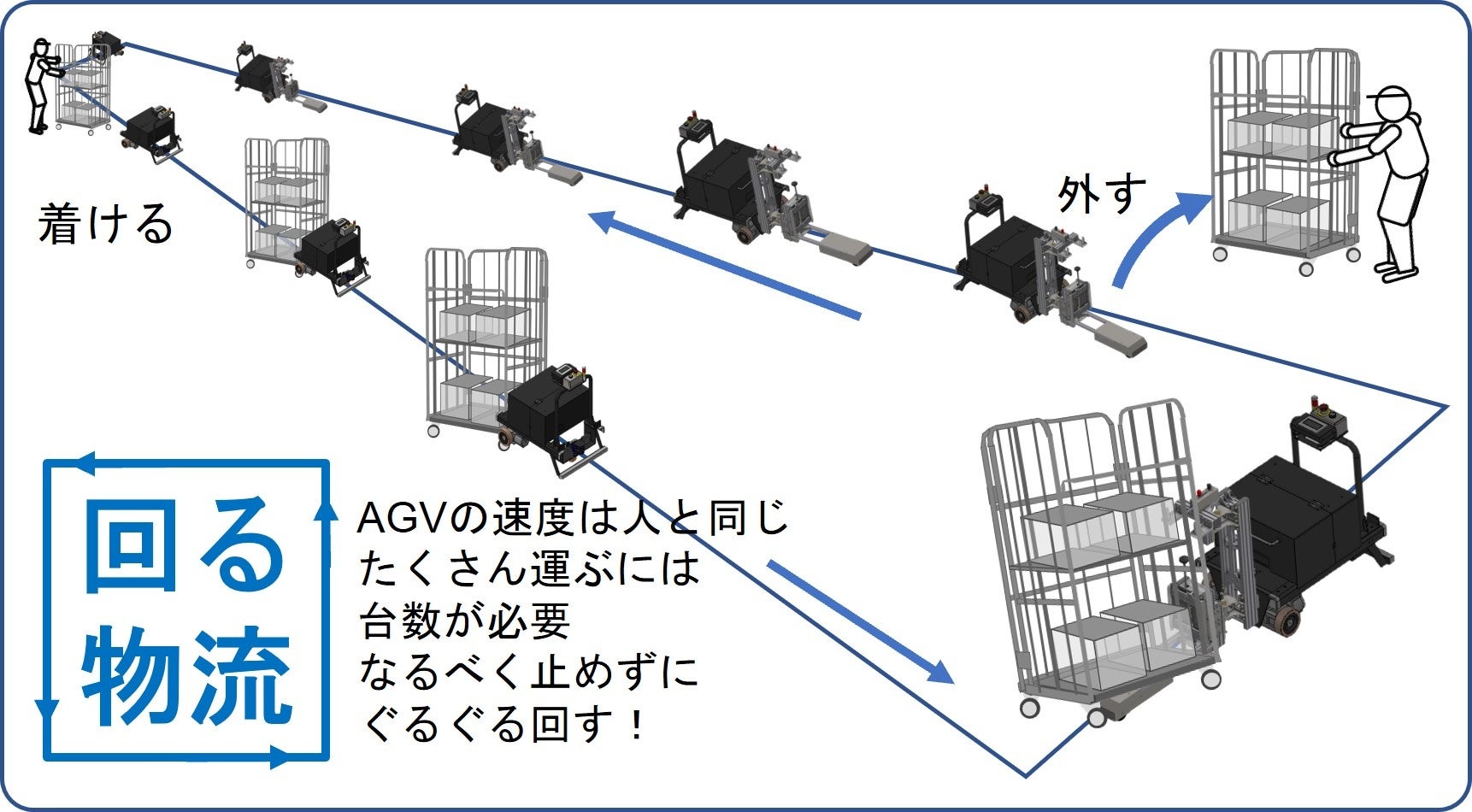 物流の現場を「キツイ」から「楽しい」に変えて物流を日本の働きたい業界No.1にするためには長い道のりを進む覚悟ですが、AGVのように楽しく効率良く進みたいものです。