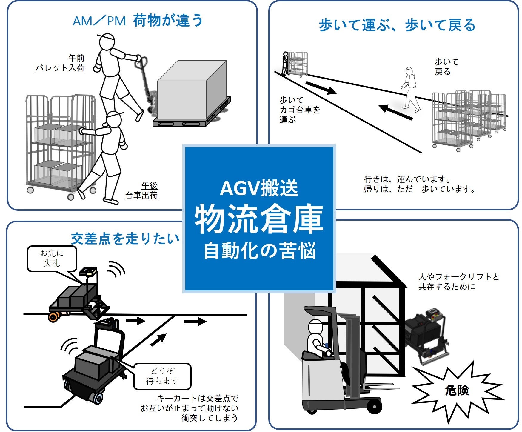 例えば、人が荷物を運ぶ現場において、行きは台車で運び、帰りはただ歩いて往復している作業者の姿をよくみかけます。AGVに運搬を任せることができれば、人は重たい荷物を長時間運ぶことや、長い距離をただ歩いて戻るという作業から離れて、もっと他の作業をすることができます。しかし、それにはいくつかのハードルがあります。