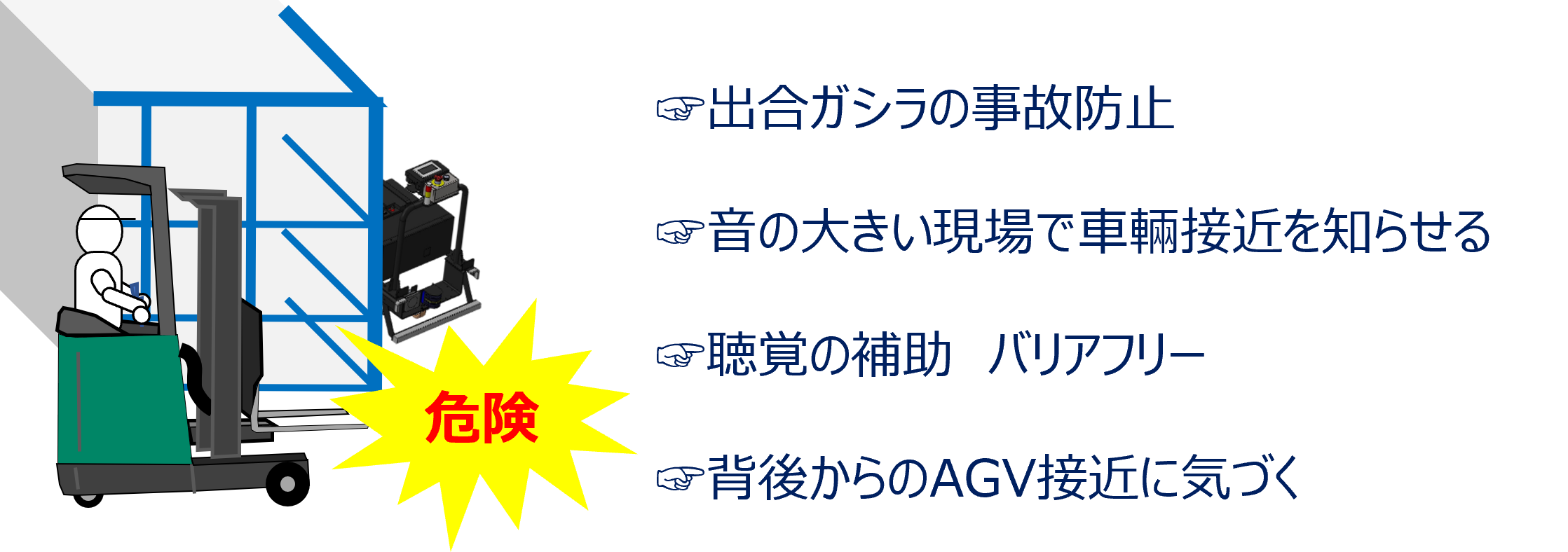 三つ目に、一般的なAGVは牽引対象物の車幅を気にして走行してくれません。本体に搭載されたセンサーがAGVと通行人の衝突を防いでも、後ろに牽引される台車がAGVよりも大きい場合、通行人やフォークリフトと衝突するリスクがあります。