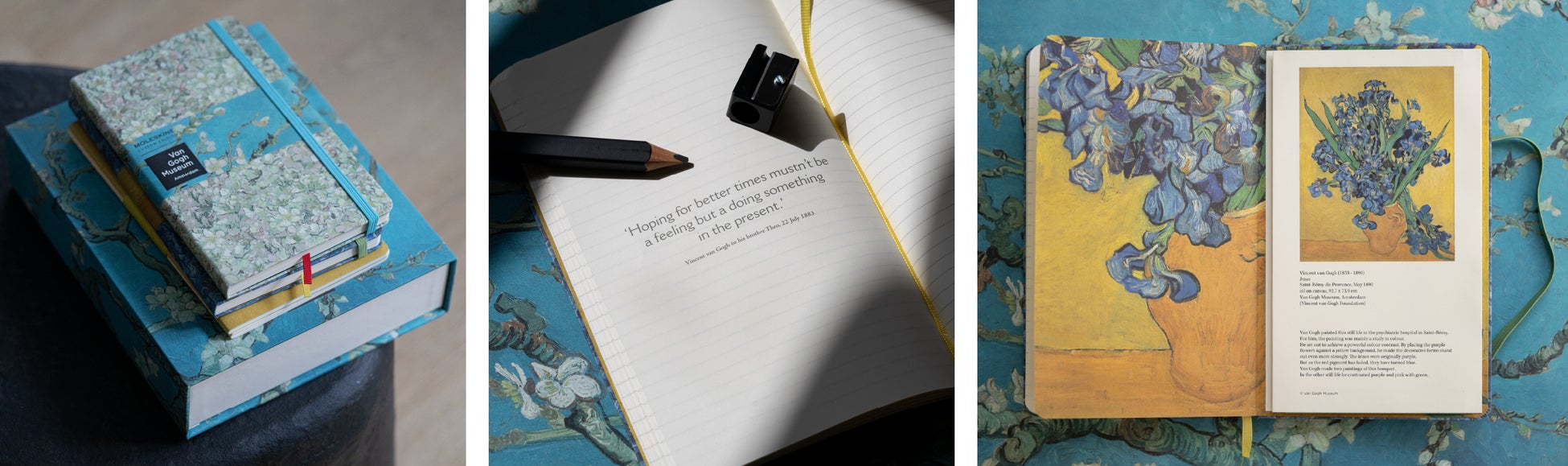 コレクションの表紙はゴッホの最も愛された絵画の中から選ばれ(1889年「ひまわり」/ 1890年「アイリス」/ 1890年「花咲くアーモンドの木の枝」)、一つ一つのノートブックにはそれぞれの絵画のストーリーと、ゴッホ自身からの心響く名言が添えられています。そして、アイボリー色のページは、あらゆる自己表現のためのキャンバスであり、個々のインスピレーションやアイデアを咲かせるために作られました。