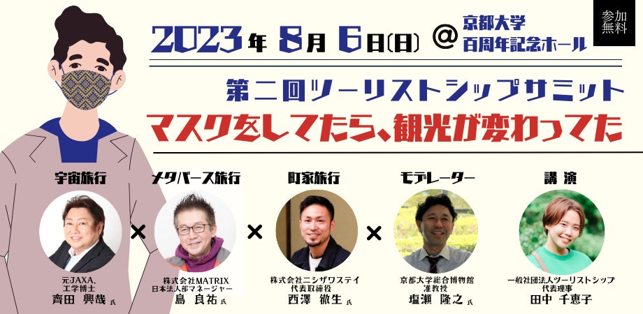 オーバーツーリズムが象徴的な地「京都」で、夏休み開始の時期に合わせて開催される本イベントでは、【町家】京町家を運営する西澤氏、【宇宙】元JAXAの斎田氏、【メタバース】VRベンチャーの島氏によるパネルディスカッションや、来場者参加型ワークショップの実施を通して、主に大学生をはじめとする若者と共に「ツーリストシップ」に対する理解を深め、持続可能な観光の実現を目指します。