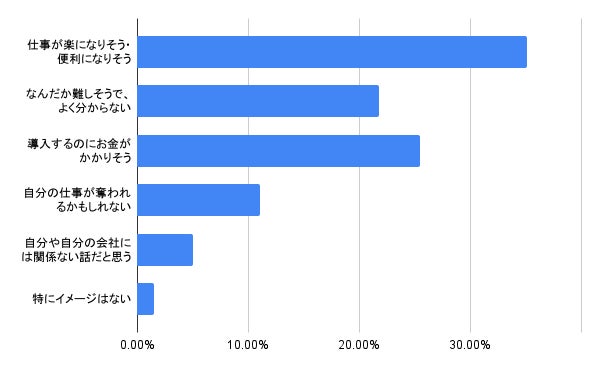多くの回答者が、AIの活用によって日常業務の負担が軽減されることに期待を寄せており、業務効率化に対する前向きな姿勢がうかがえる。単純作業の自動化や情報検索の迅速化など、実利的なメリットが浸透しつつあることを示している。