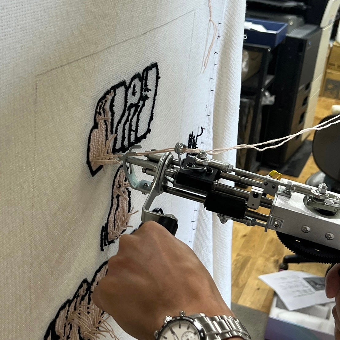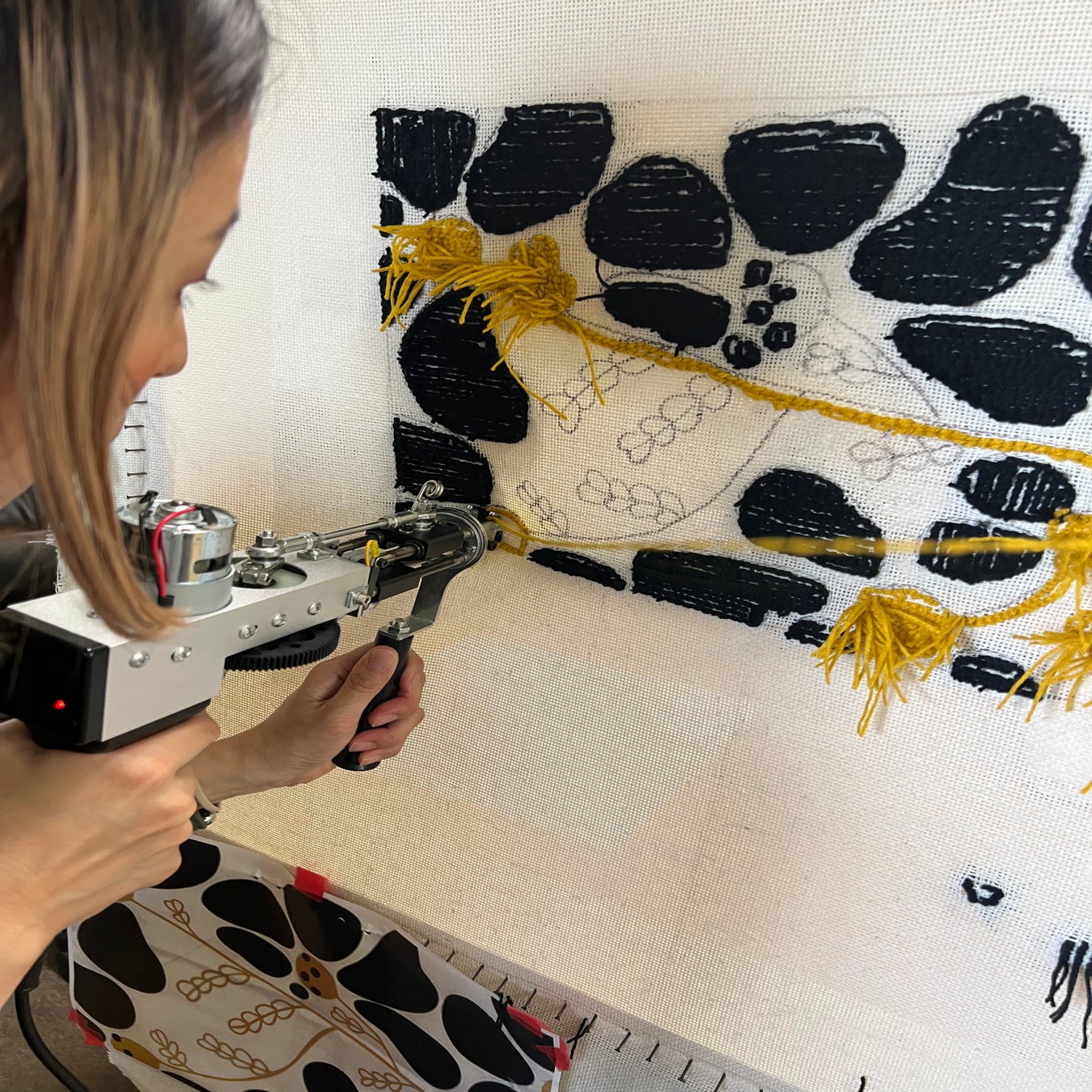 タフティングは、タフティングガンを用いて行われ、主にカーペットやラグなどのアイテムを作るために使用される技術です。この技術では、基布の裏側から特別な針を通して糸を引き抜き、表面にラグの表面となるものを形成します。これにより、独自のデザインや模様が作り出され、アイテムに特有の質感と外観が与えられます。タフティングは現在アメリカやヨーロッパ中心に話題となっており、個性的なアート作品や実用的なインテリアアイテムの制作に利用されています。