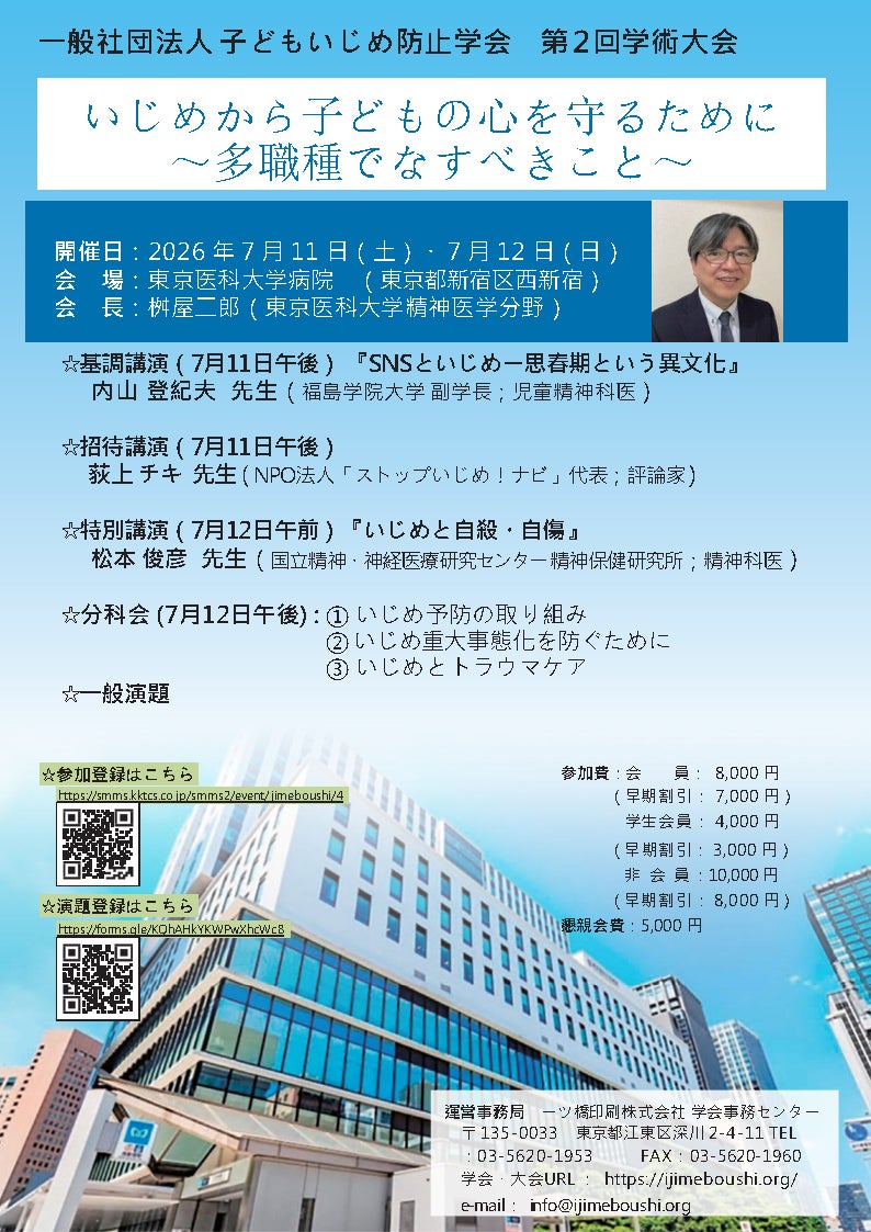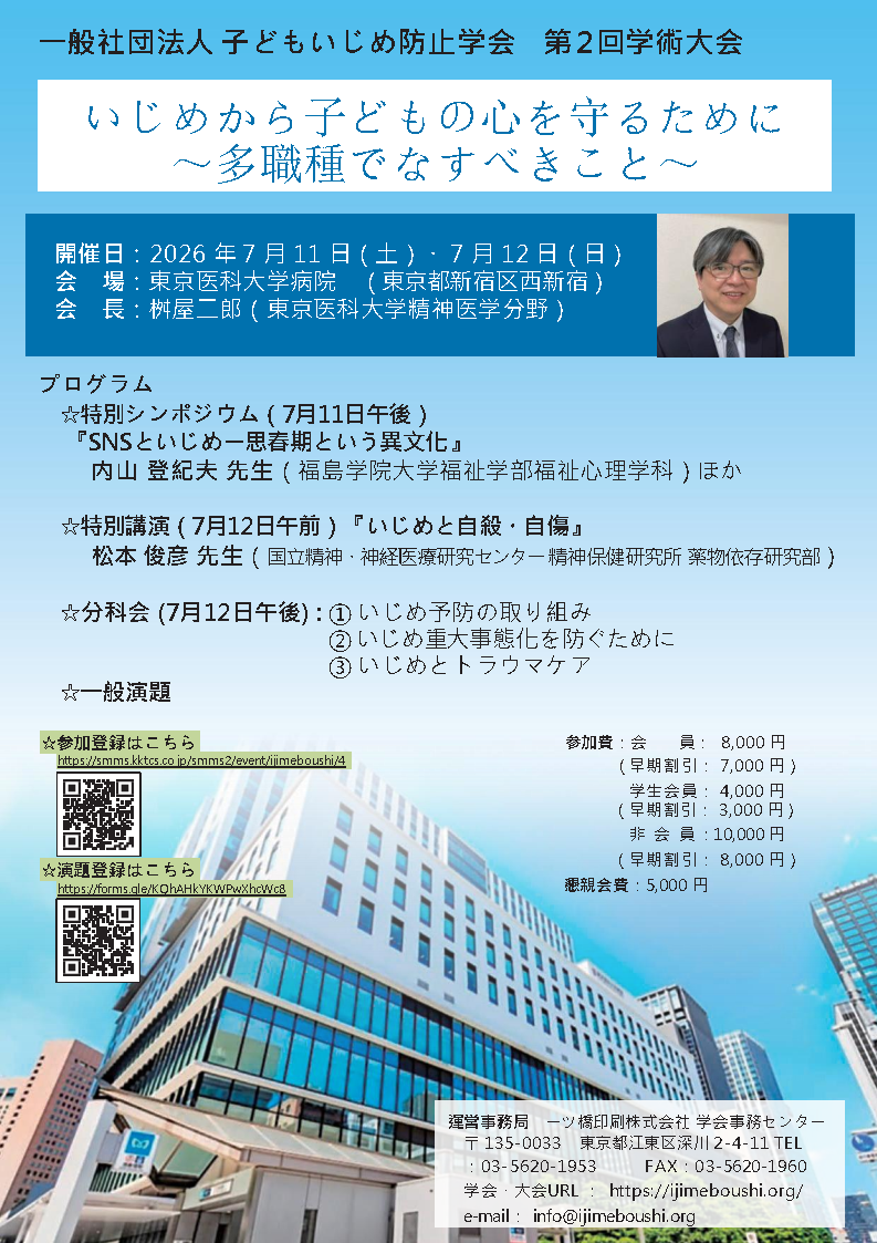 来る2026年7月11日(土)・12日(日)に東京医科大学病院(東京都新宿区)に於いて、子どもいじめ防止学会第2回学術大会を開催いたします(大会長:桝屋二郎)。