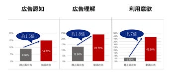 売りたい商品や宣伝したい内容などを動画にして訴求することで、圧倒的な情報量を与える事ができ、静止画と比較しても広告認知は約1.6倍、広告理解は約1.8倍で、利用意欲に関しては約7倍の効果があると言われています。