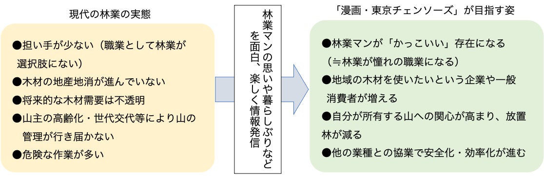 今後、森林の価値を最大化して産業として発展させていくためには、一般の方への木材需要の喚起や担い手の確保、また他の産業との協業が必須であり、そのための第一歩としてまずは「林業」という職業をもっと身近に感じてもらうことが必要だと考え、「漫画・東京チェンソーズ」の企画を立ち上げました。