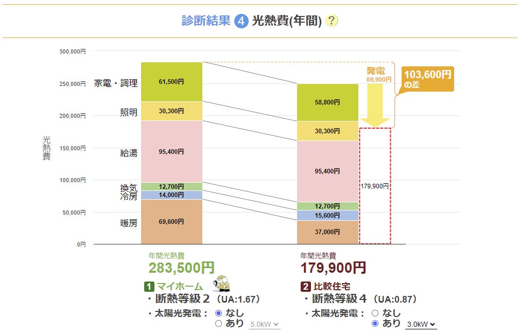 ・「マイホーム断熱診断」で示される光熱費削減額や健康維持費削減額は、あくまでも比較検討の目安を示す推定値で、実際の光熱費や健康維持費削減額を保証するものではありません。