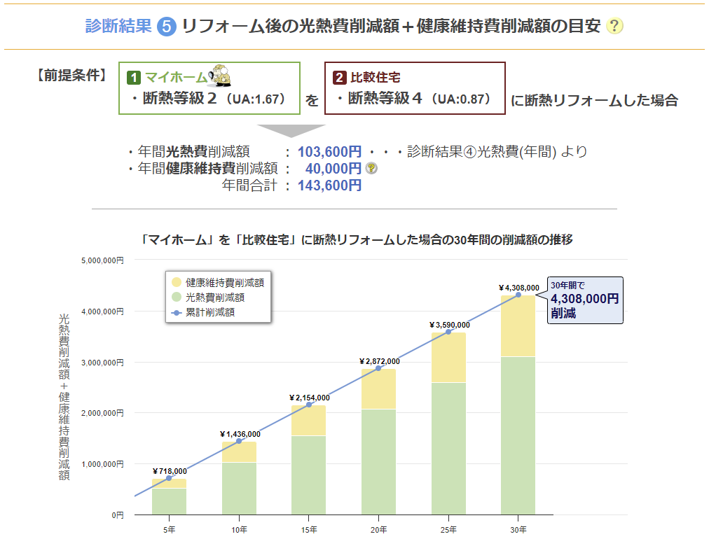 断熱リフォームは、断熱性能の向上によって「光熱費が削減できる」、「室温が高く保て寒くない」などのメリットに加え、寒さに起因する様々な疾病が生じにくくなることで、健康を維持するための費用などの削減にもつながるメリットが見込めます。これを簡単操作でわかりやすくグラフ化することで、どの程度の費用削減効果が期待できるかの目安を利用者に実感いただけます。