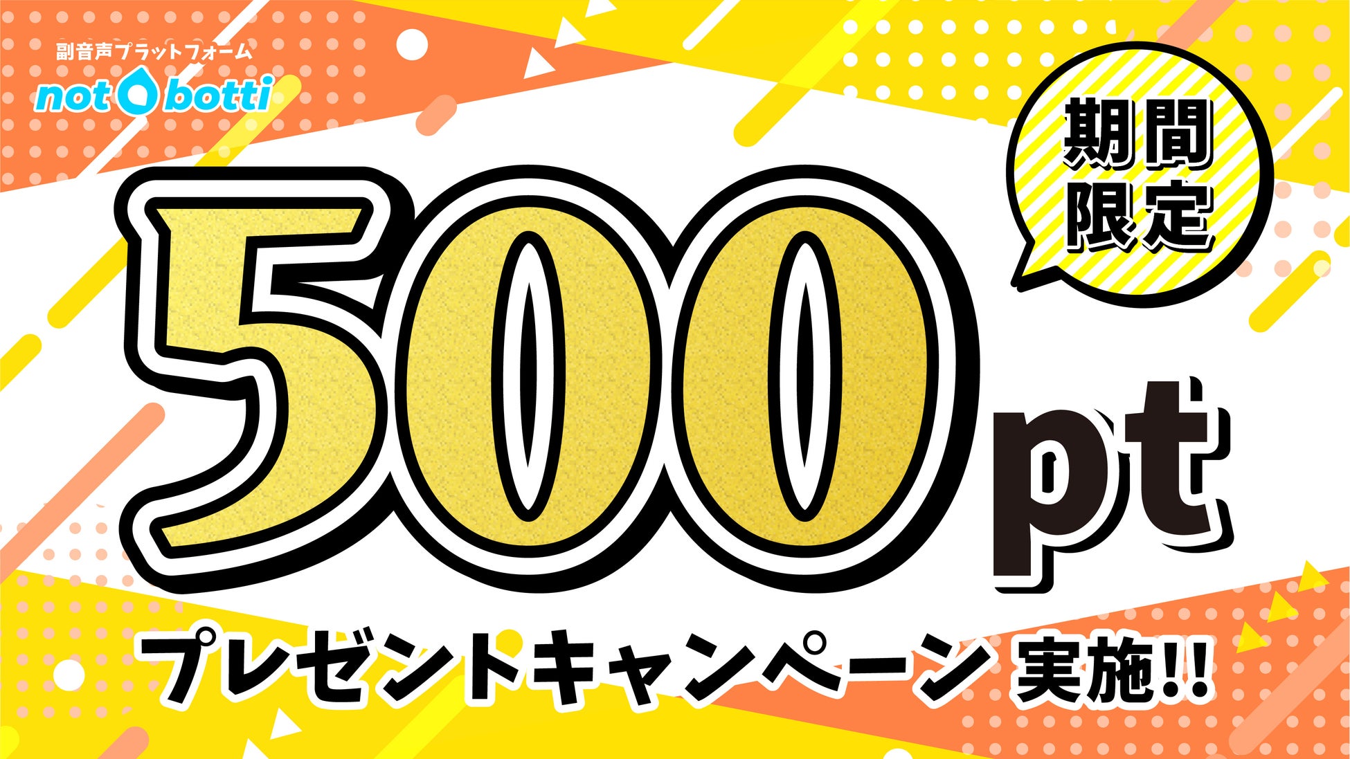『not botti』では、新規に会員登録をしていただいた方に、更なるユーザー体験をご提供するために特別なキャンペーンを開始いたします。『not botti』をダウンロードし、新たに会員登録を完了した方々全員に【500円分】のポイントをプレゼントいたします!これらのポイントはアプリ内で副音声の購入にご利用いただけます。