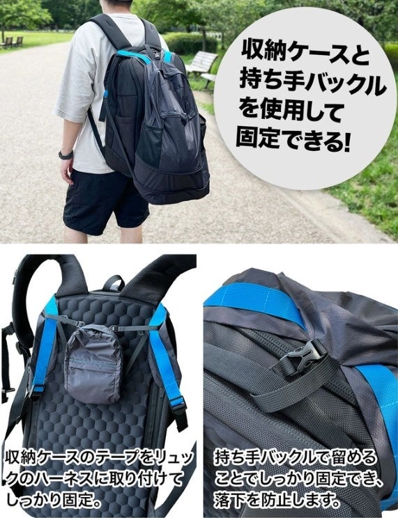 荷物が多いときのサブバッグとして使用する際に別のリュックに被せて装着することが可能です。又、防水生地なので雨よけとしても機能します。