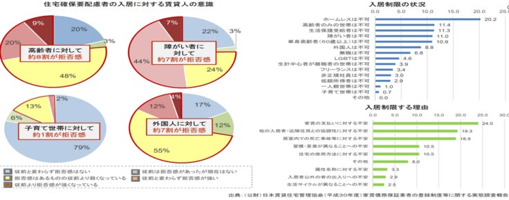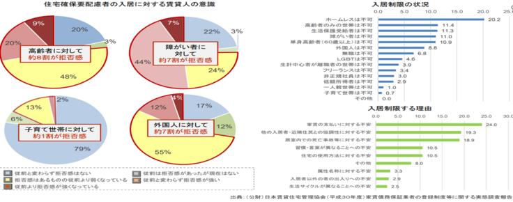 空き家は増加しています。しかしながら、住宅要配慮者(低額所得者<15万8千円以下>、被災者、高齢者、障害者、子育て世帯)に対する住宅は不足しています。セーフティネット住宅制度がありますが、まだ足りていません。民間の空き家があるにもかかわらず入居できない理由は、家主側の賃料の不安などの理由から入居を拒むことで、住宅要配慮者は民営の入居が困難になるという問題が発生していることがわかります。