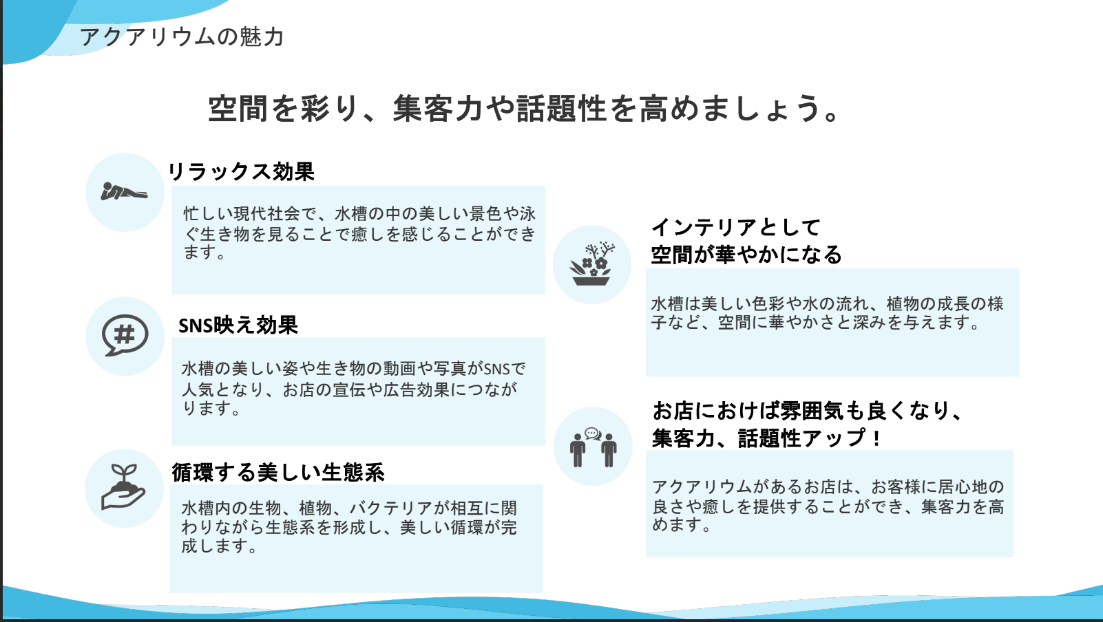 店舗はインテリアや癒しとしてアクアリウムを置くことができ集客に繋げられる。アクアリストは自己表現の場としてカフェにあるアクアリウムをメンテナンスすることで趣味の一歩先へ。普段はあまり関係のない業種をマッチングし、双方を盛り上げていける。そんなプラットフォームを提供します。