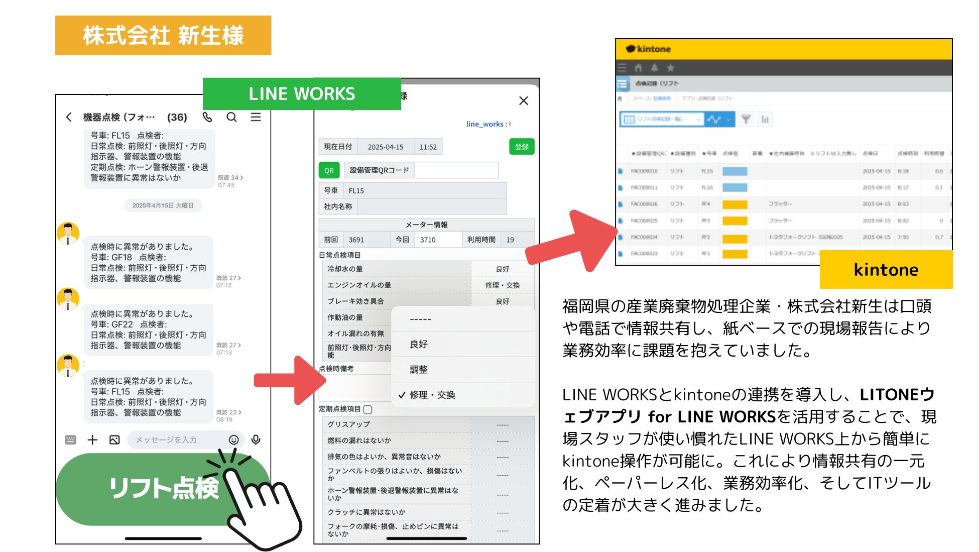 LITONEウェブアプリ for LINE WORKSの導入により、2次元コードで点検フォームを即時に立ち上げ、スマホで簡単に記録できる仕組みを構築。現場スタッフが無理なく使えるUI設計にこだわった結果、点検精度が向上し、リアルタイムでの情報共有が可能になりました。
