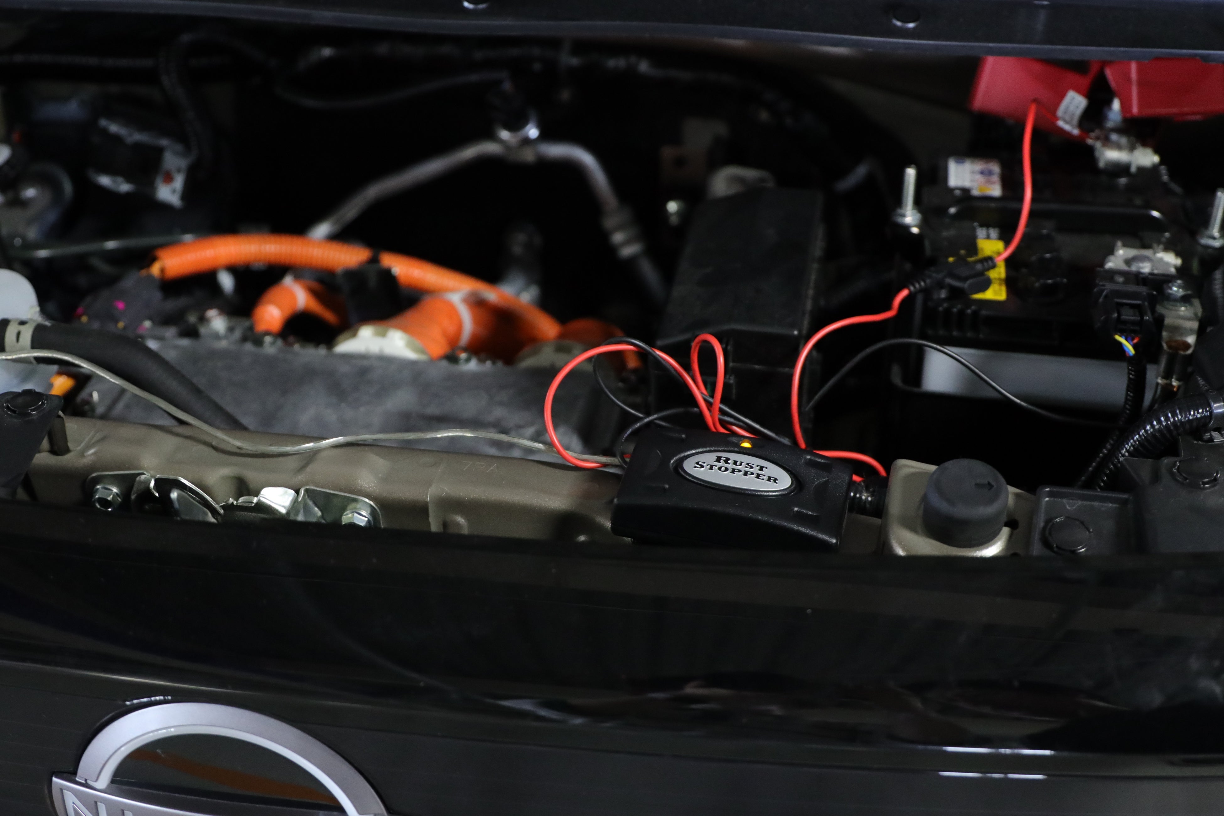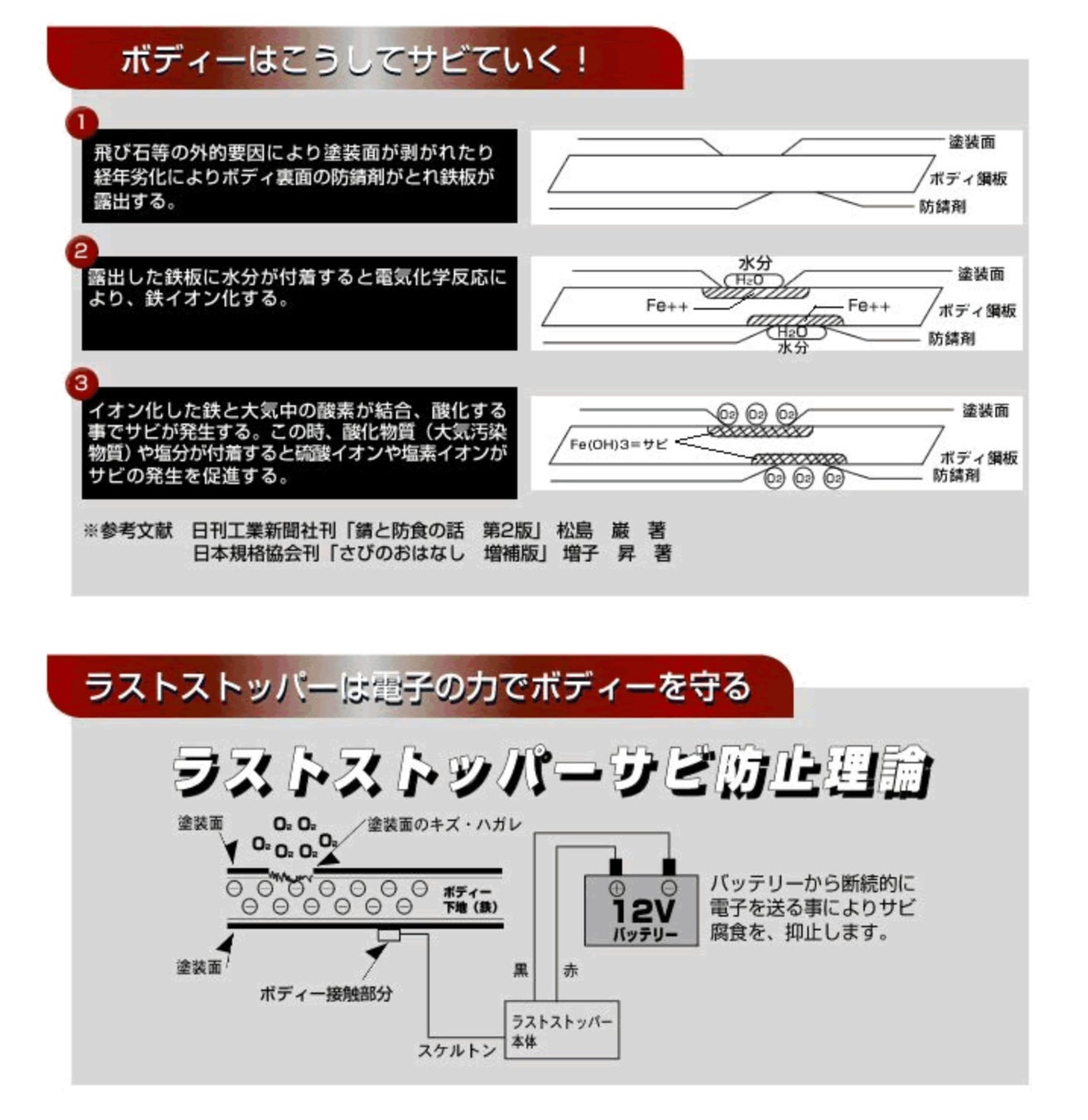 「ラストストッパー」では「電子防食法」の原理を応用し、車載バッテリーから得られた電子をボディ全体に流すことによって「鉄イオン化」を防ぎ、サビの発生を抑止します。