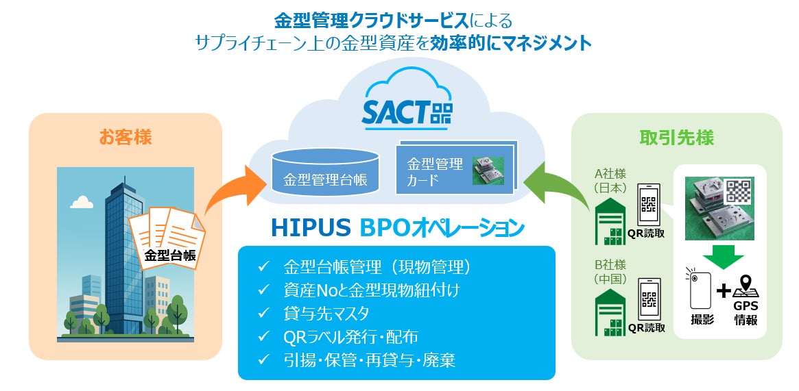 株式会社HIPUS(本社:東京都千代田区、代表取締役:浅海清、以下当社)は、金型管理に特化したクラウドサービスと業務代行(BPO)を組み合わせた「SACT(Smart Assets Confirming & Tracking)」を正式にリリースしました。