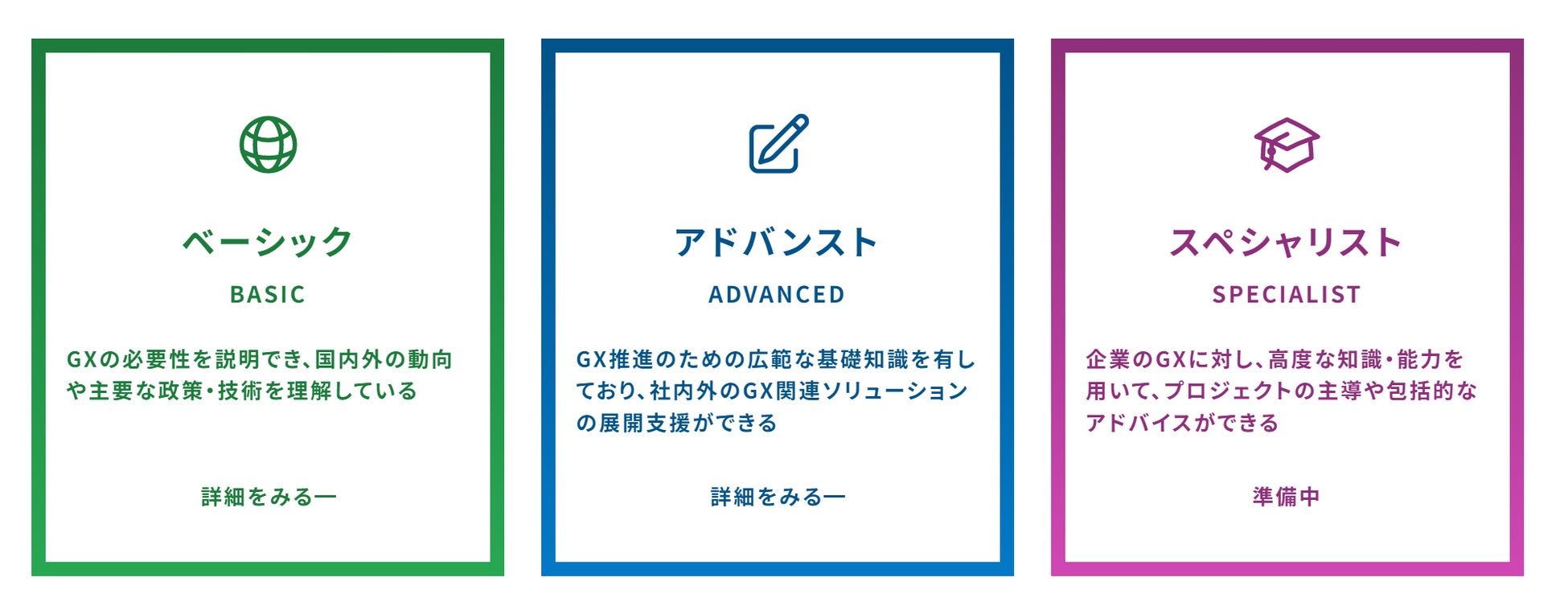 検定はベーシック/アドバンスト/スペシャリストの3つのレベルに分かれており、それぞれのレベルでGXに関連するリテラシーを問う検定となっていますので、業種や職種を限定せず、さまざまな目的での活用が可能です。また、2023年夏に開始予定の環境省脱炭素アドバイザー資格制度の順次認定申請中ですので、本検定の合格によって、GXの知識を外部にアピールすることも可能です。