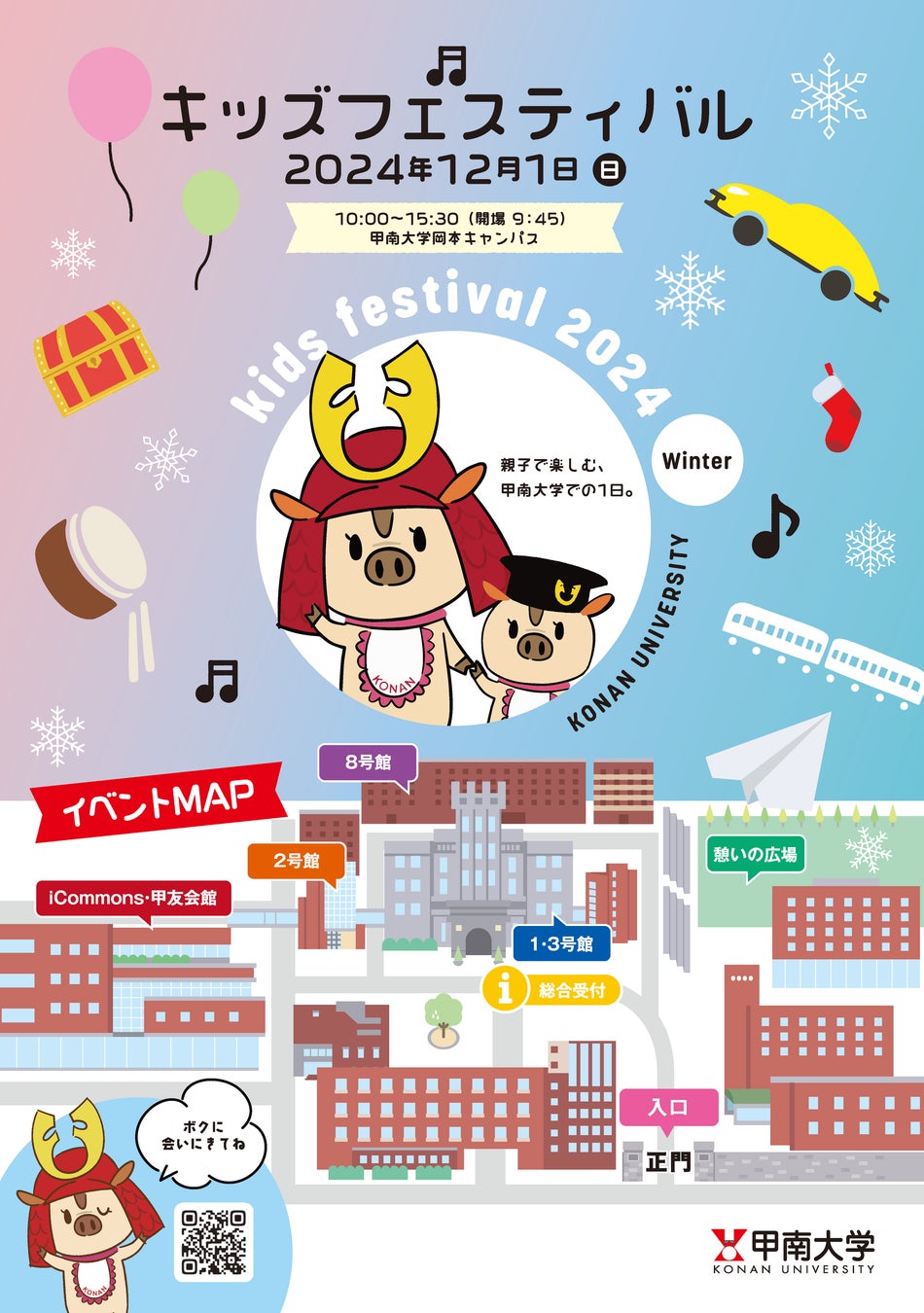 「親子で楽しむ、甲南大学での1日。」をコンセプトに、地域の皆様に感謝の気持ちをお伝えすることを目的として、2017年からスタートしたイベントです。回を重ねるごとに来場者が増え、今年3月に開催した前回は、過去最多の約2,700人が来場されました。今回は、より充実した縁日プログラム、消防車やパトカーとの記念撮影など、今回も盛りだくさんの内容で皆様の来場をお待ちしております。
