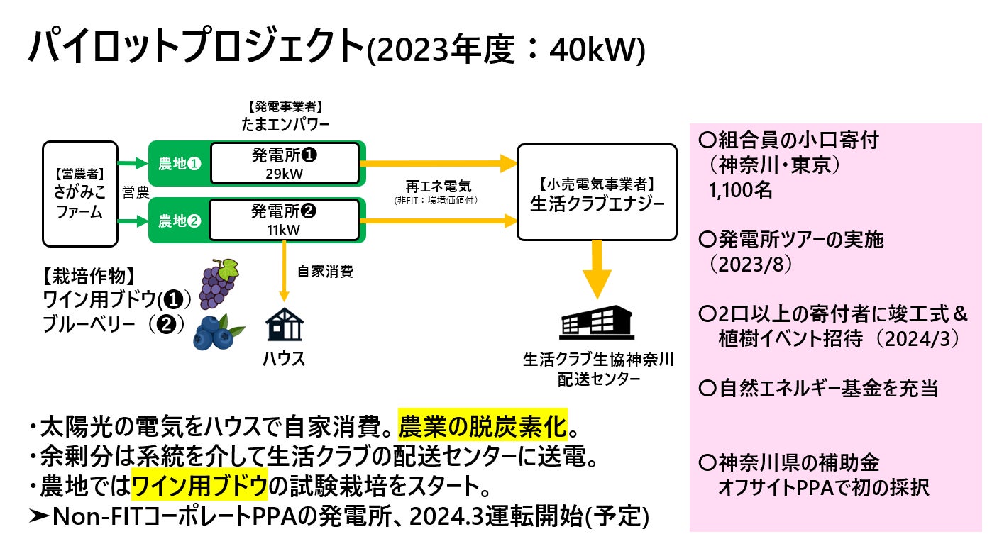 本事業は、たまエンパワー㈱が発電事業者となり、FITを介さずに生活クラブ神奈川と20年間の売電契約を締結する「非FIT・オフサイトコーポレートPPA方式」で実施します。建設にあたっては、「令和5年度神奈川県自家消費型再生可能エネルギー導入費補助金」にオフサイトPPA事例として初採択された他、生活クラブ自然エネルギー基金、生活クラブ組合員から寄付を集めました。営農は㈱さがみこファームがワイン用ブドウ3種の試験栽培を行います。