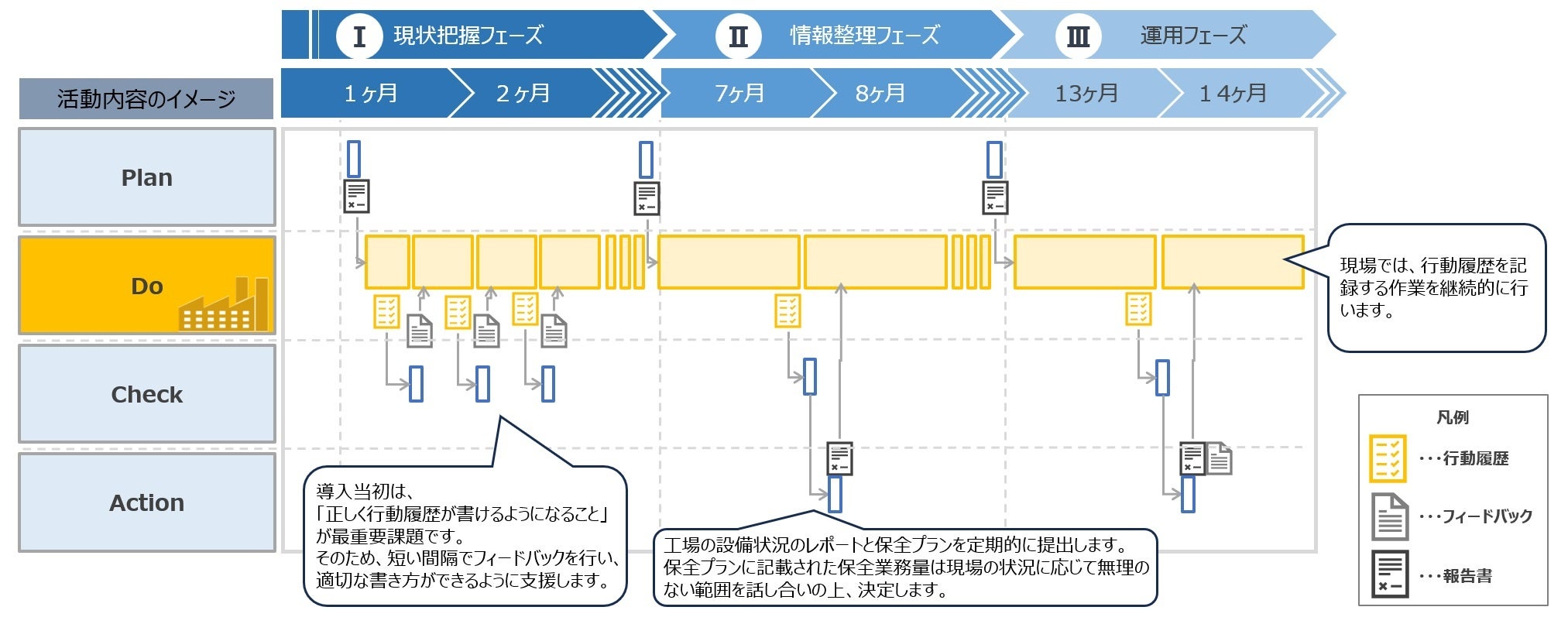 サービス開始初月に工場に当社のエキスパートが訪問し、行動履歴の記録表や記録項目の設計を行います。その後は、現場で記録した行動履歴を提出するだけで、設備保全の目標値や管理項目の定期レポートと具体的な保全活動がわかる保全プランをお届けします。
