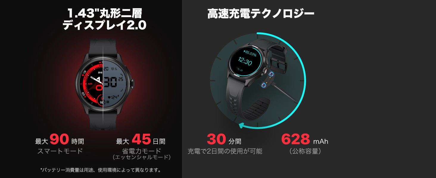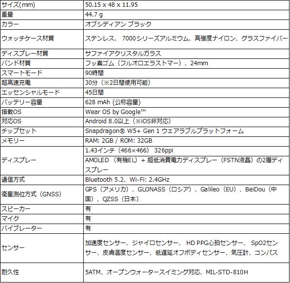 前モデルに引き続き、発色が鮮やかなAMOLED(有機EL)ディスプレイの上に超低消費電力ディスプレイ(FSTN液晶)を採用しています。その結果、前作よりもバッテリーの持続時間が向上し、「Wear OS by Google」を搭載したスマートウォッチとして、業界最長レベルのバッテリー性能を誇り、スマートモードでは最大90時間、エッセンシャルモードでは最大45日間持続するロングバッテリーが特徴です。超低消費電力ディスプレイは、スマートモードとエッセンシャルモードをシームレスに切り替えることが可能です。さらに上述したように傷のつきにくいサファイアクリスタルガラス製ディスプレイは、屋内でのワークアウトから登山やトレイルランニングまで、過酷な環境下でも鮮明な視認性を保証します。