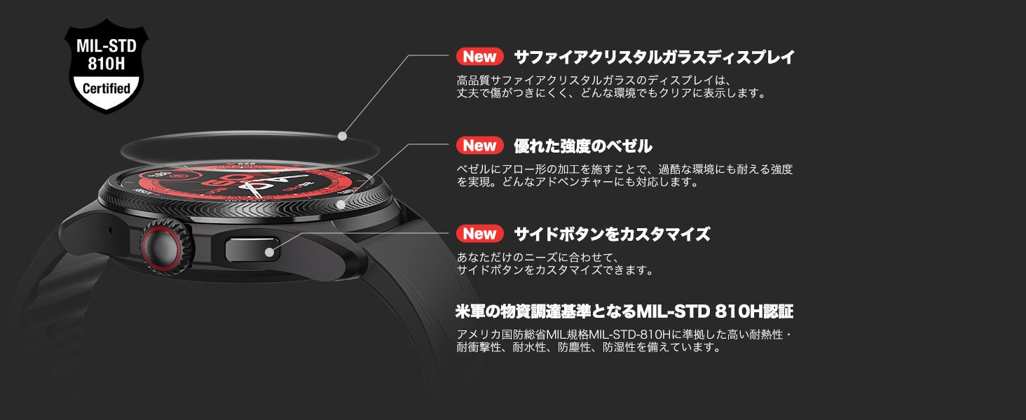 アウトドア環境下での耐久性を高めるためにディスプレーには、高級腕時計にも使われているサファイアクリスタルガラスを採用しています。サファイアクリスタルガラスは、モース硬度尺度で9と評価され、ダイヤモンド(※モース硬度尺度で10)に次ぐ硬さを持っています。人工的に作られたガラスながら、高い耐久性を持っているのが大きな特徴です。そのため、ぶつけたりこすったりするだけでは割れることが無く、アウトドア環境下で使用するスマートウォッチのディスプレー素材としては申し分ない耐久性があります。