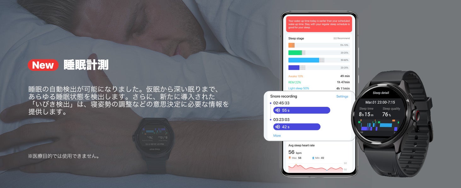 Mobvoi Healthアプリの最新機能として、「いびき検出機能」があります。この革新的な機能によって、ユーザーは自身の睡眠中の健康状況について十分な情報を得た上で判断することが可能です。その結果、寝る姿勢の調整や専門家によるアドバイスの必要性など、この機能はユーザーの全般的な睡眠の質と健康を向上させるための貴重な洞察を提供します。