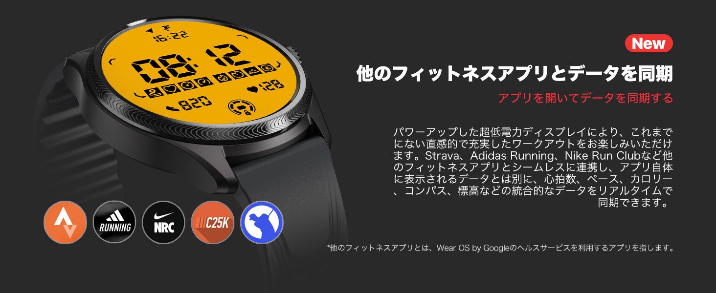 TicWatch Pro 5 Enduroのユーザーが、Strava、adidas Running、Nike Run Clubなどの人気のフィットネス・ランニングアプリをスマートフォンで開くことで、実際にワークアウトを行う際に、最上部の超低消費電力ディスプレイ(FSTN液晶)上にリアルタイムでワークアウトの様々なデータを表示します。表示されるデータは、元々のアプリの表示データ以外に、心拍数、ペース、速度、消費カロリー、コンパスの方位、標高などの情報も表示させることが可能です。