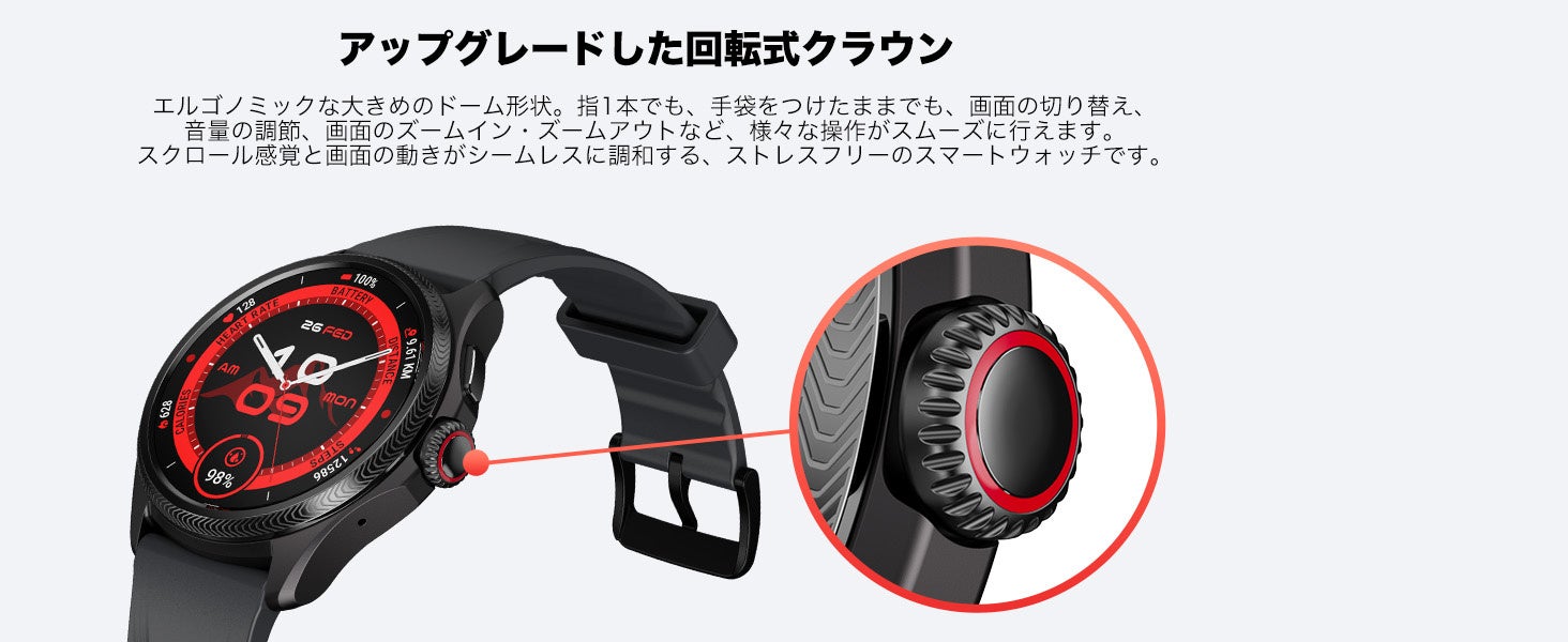 前モデルTicWatch Pro 5から採用された回転式クラウンを回すことで、タッチスクリーンだけでなくアナログ感覚でも多彩な操作ができます。指1本でも、手袋をつけたままでも、画面の切り替え、音量の調節、画面のズームイン・ズームアウトなどの様々なコントロールが可能です。ボタンのスクロール感覚と画面操作がシームレスに連動します。さらに回転式クラウンを再設計することで使いやすくアップグレードしました。クラウンの形状をドーム型に変更することで、触感をよくし、よりスムーズになるように改良しました。さらに前モデルよりも誤動作がしにくくなっています。