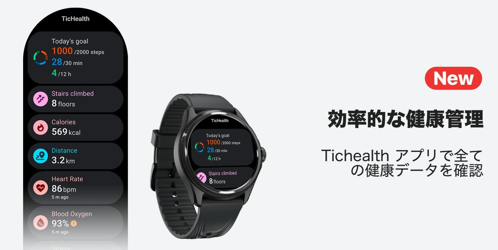 Mobvoi 製「TicHealth」アプリがプリインストールされています。心拍数、血中酸素、睡眠、ストレス、健康目標などの機能が、TicHealthアプリに統合されています。毎日の活動レベルのモニタリングから心拍数、睡眠パターンなどのトラッキングまで、健康トラッキングを合理化し、よりスマートに自身の健康状態を把握できるようにしていきます。