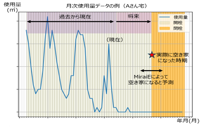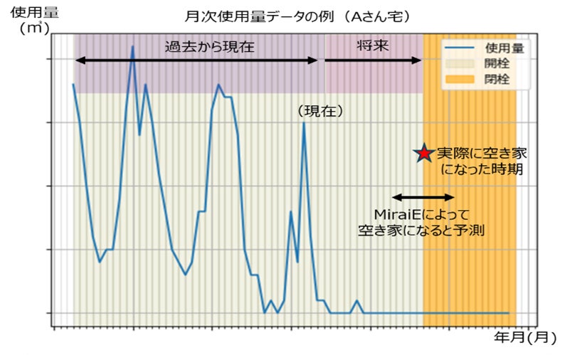 ※MiraiE.ai(ミラーエ)は、効果的かつ効率的な空き家対策、老朽インフラ対策の実現に向け、社内データを用いて現在から将来までの住居単位の空き家発生・再入居を予測するAIシステム(マイクロベースによる特許取得済み)。