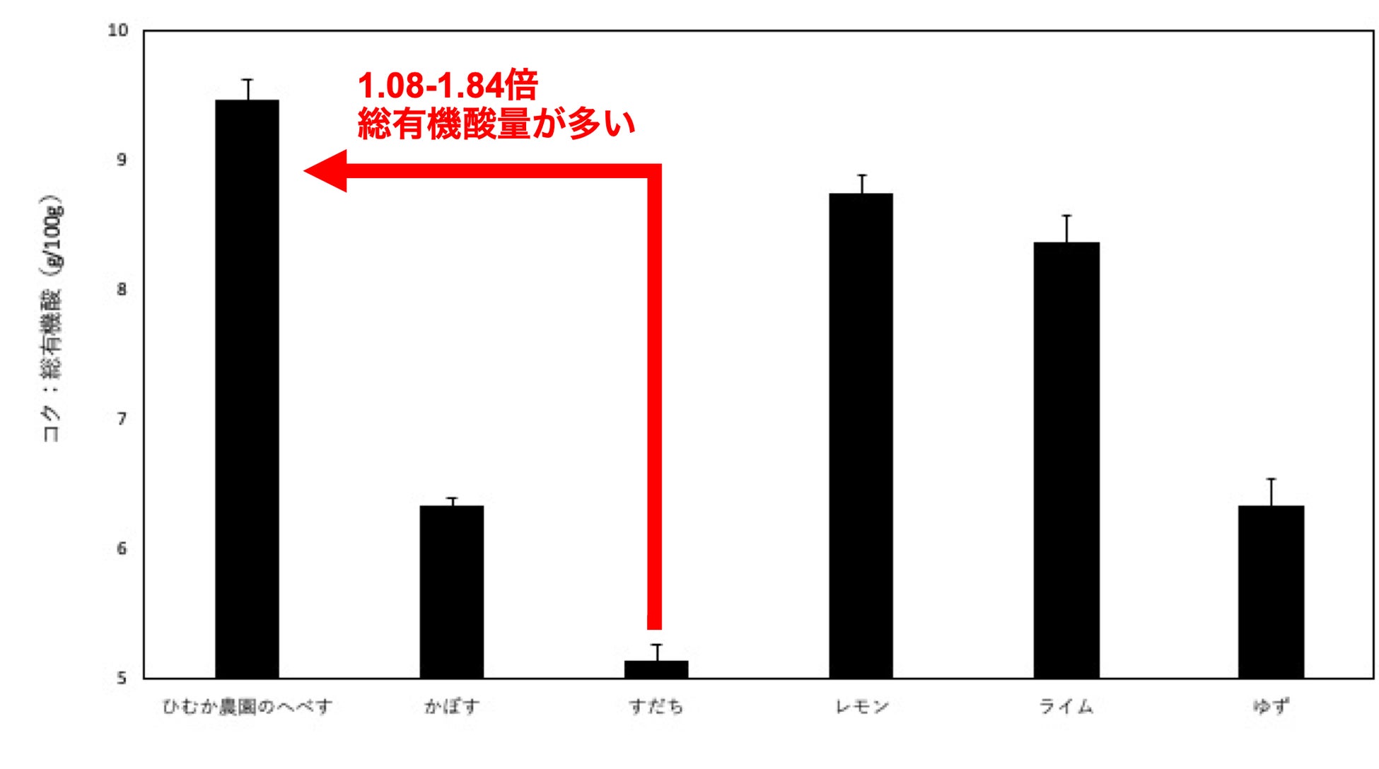 「ひむか農園のへべす」の総有機酸はかぼす、すだち、レモン、ライムおよびゆずよりも1.49倍、1.84倍、1.08倍、1.13倍および1.49倍多い