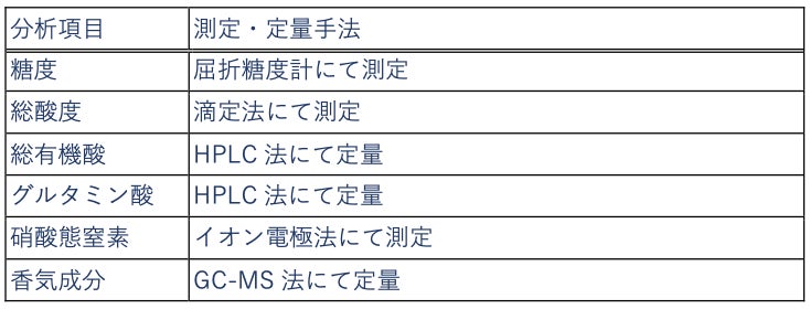 測定・定量については、香気成分以外は各柑橘の果汁を使用し、香気成分のみ果汁および果皮を使用して分析・調査を実施