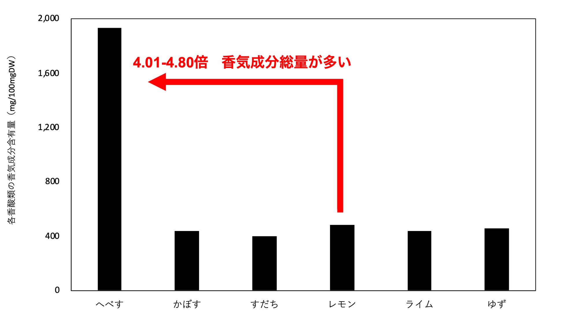 「ひむか農園のへべす」の香気成分総量はかぼす、すだち、レモン、ライムおよびゆずよりも4.40倍、4.80倍、4.01倍、4.40倍および4.22倍多い