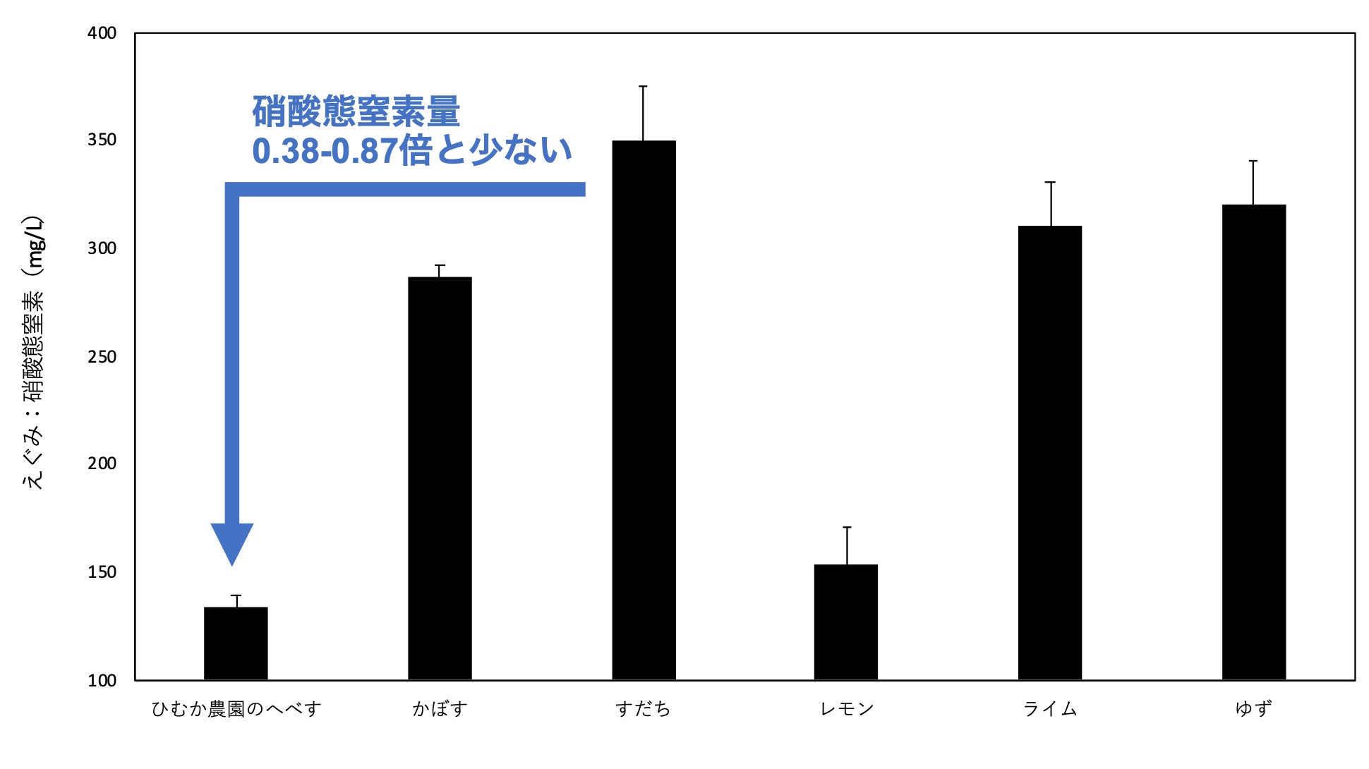 「ひむか農園のへべす」の硝酸態窒素量はかぼす、すだち、レモン、ライムおよびゆずよりも0.47倍、0.38倍、0.87倍、0.43倍および0.42倍と少ない