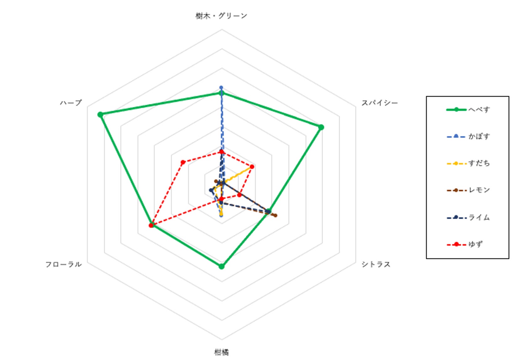 特にスパイシー香、ハーブ香が多いことから、スパイスやハーブのような使用方法もできる可能性を秘めており、へべすの使用・調理方法が広がる可能性を示唆する結果となりました。